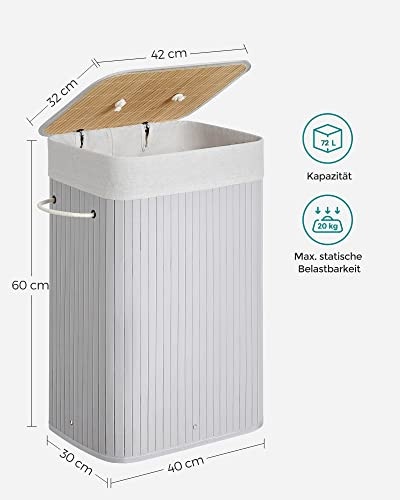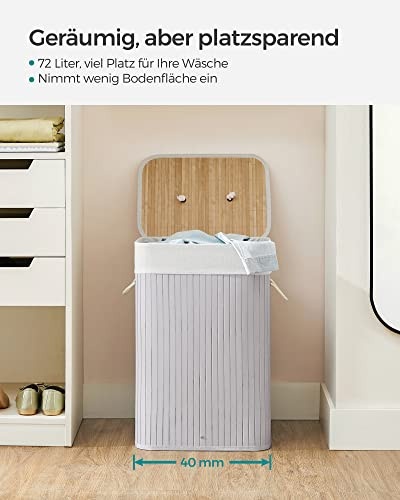 Cosul de rufe Songmics, cu dimensiuni de 40x30x60 cm, este ideal pentru depozitarea eficientă a rufelor murdare. Dotat cu un capac ușor de utilizat cu o singură mână, acesta împiedică scurgerea mirosurilor neplăcute și protejează împotriva prafului. Cu o capacitate de 72 litri, cosul ocupă puțin spațiu, fiind perfect pentru colțurile strâmte. Stabil și pliabil, suportă până la 20 kg datorită benzilor de bambus robuste. Geanta interioară din bumbac, detasabilă și lavabilă, facilitează transportul rufelor. Montajul este simplu, iar manerele laterale asigură o manevrabilitate ușoară.