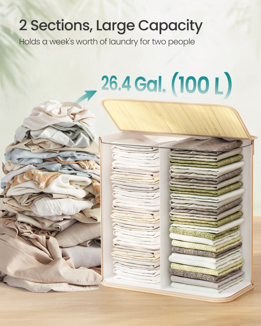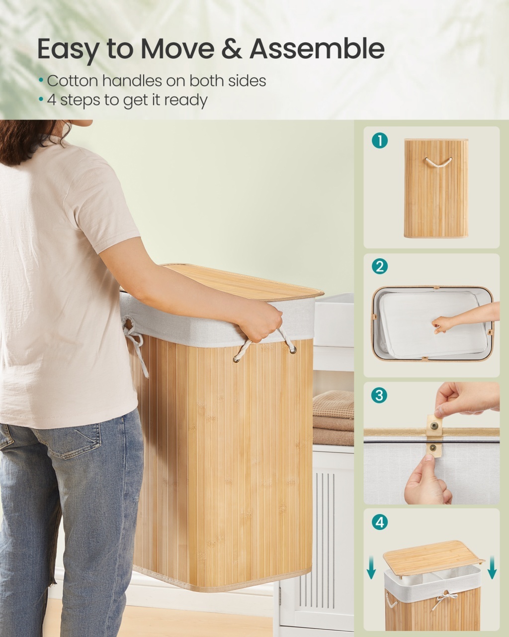 Coșul de rufe Songmics, cu dimensiuni de 52 x 32 x 61 cm, combină un design modern cu materiale de calitate, fiind construit din bambus robust și un cadru metalic. Cu o capacitate de 100 L și două compartimente, permite sortarea eficientă a rufelor, iar mânerul din frânghie de bumbac asigură transportul facil. Husa internă detașabilă, din amestec bumbac-poliester, este lavabilă la mașină pentru întreținere ușoară. Montajul este simplu, iar finisajul natural adaugă un plus de rafinament oricărui spațiu.