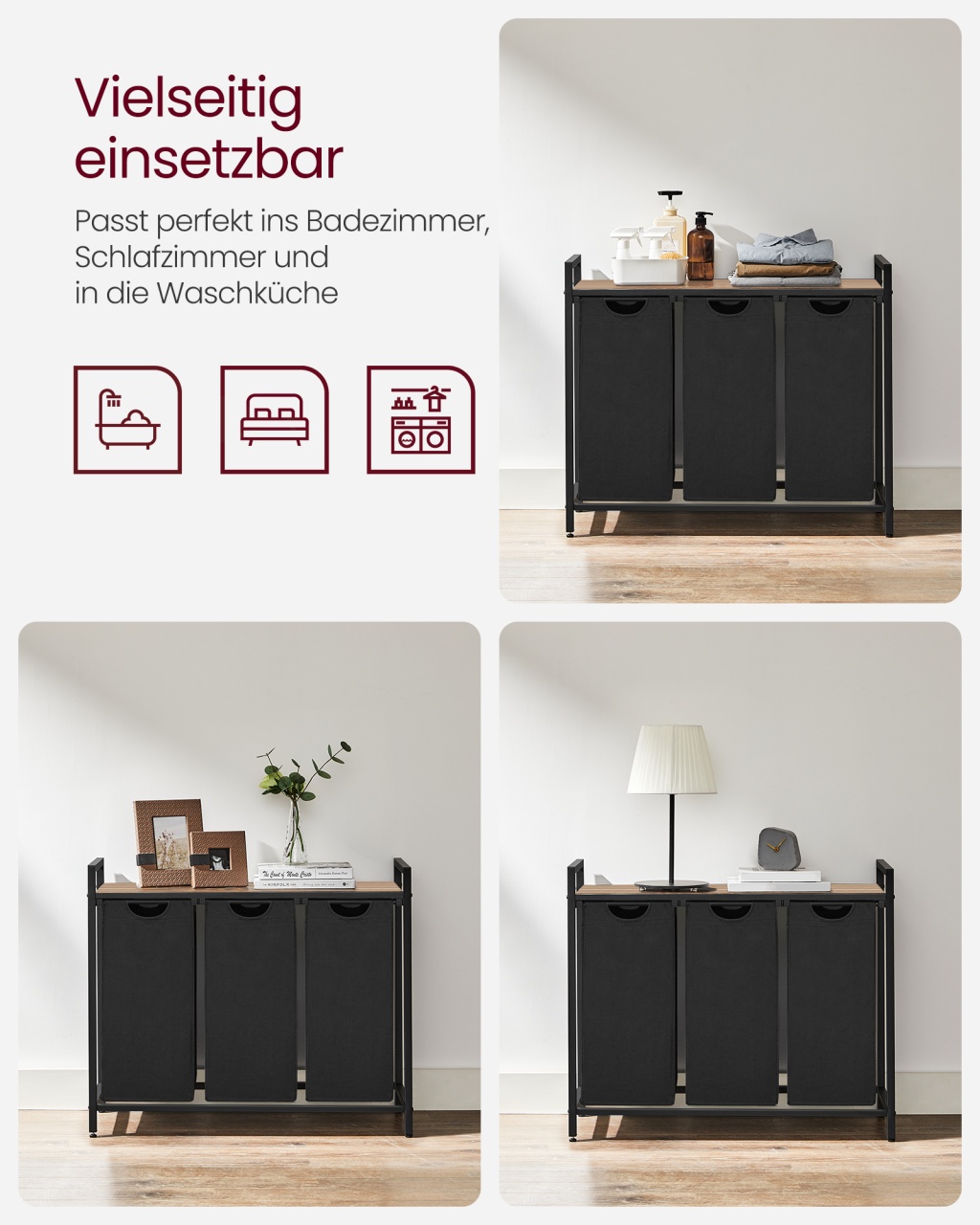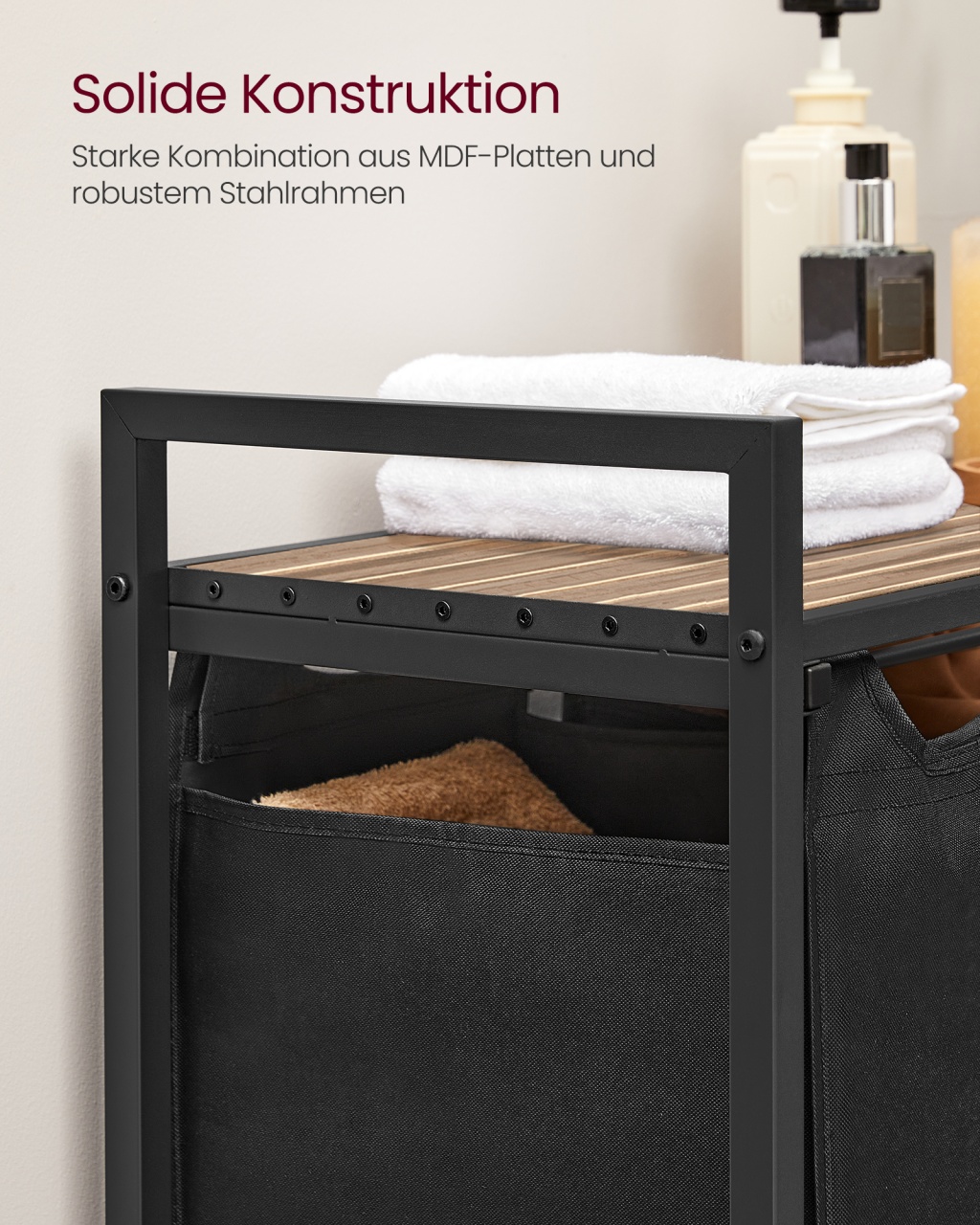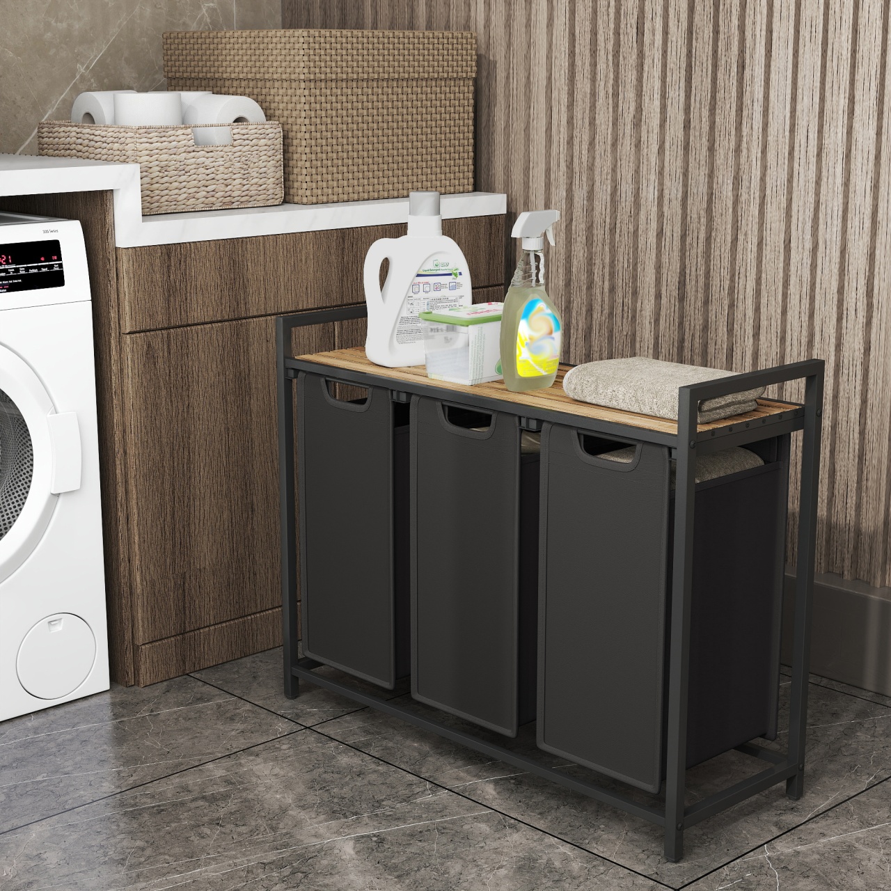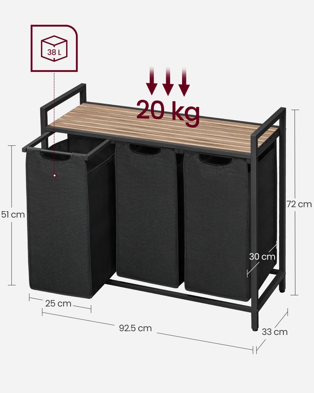 Coș de rufe Vigo, Negru — Sortare igienică și practică în 3 compartimente Design și materiale de calitate Un companion proaspăt și ordonat pentru baie sau spălătorie: finisaj vintage maro-negru, linie compactă și atemporală care se potrivește ușor într-un colț. Construcția combină Lemn MDF (MDF = Medium Density Fiberboard, adică fibră de densitate medie), panouri din Lemn PAL (Particleboard tradus ca Lemn PAL) și o structură din Metal , iar sacii detașabili sunt din material textil Oxford, ușor de manevrat. De asemenea, sertificarea FSC indică gestionare responsabilă a resurselor lemnoase (FSC = Forest Stewardship Council). Funcționalitate și organizare Gândește-te la rutina ta îmbunătățită: trei coșuri separate pentru sortare rapidă (fiecare cu dimensiuni 25 x 30 x 51 cm), o poliță practică pentru detergenți sau prosoape și o amprentă redusă la sol (92.5 x 33 x 72 cm). Acest sortator oferă 3 compartimente pentru sortare imediată, poliță utilă pentru accesoriile frecvente și saci detașabili pentru transport ușor spre mașina de spălat. Montaj și întreținere Montați ușor cu instrucțiuni ilustrare și piese clar etichetate; produsul include și kit de anti-răsturnare (2 x Anti-tilt protection) pentru stabilitate suplimentară. Curățarea se face simplu cu o lavetă moale pentru suprafețele din Lemn MDF și Lemn PAL, iar sacii textili pot fi îndepărtați pentru curățare și manevrare. Alte caracteristici practice: picioare reglabile pentru nivelare și accesorii de montaj incluse. Comandă acum și transformă-ți spațiul! Organizează-ți rutina zilnică cu stil: adaugă acest coș de rufe Vigo în coșul tău și bucură-te de o baie sau o spălătorie mai curată, mai ordonată și mai igienică. Detalii tehnice complete Dimensiuni și greutate Dimensiuni produs: 92.5 x 33 x 72 cm Greutate produs: 8.1 kg Capacitate maximă de susținere: 30 kg Materiale și caracteristici Material corp: Lemn MDF, Metal Material finisaj/tapițerie: Material textil Oxford Culoare: Negru Număr pachete: 1 Montaj și pachet Stare asamblare: Neasamblat Conținut pachet: 1 x Coș de rufe cu poliță, 2 x Protecții anti-răsturnare, Accesorii de montaj, Instrucțiuni Stil și origine Stil: Rustic Destinație recomandată: Baie