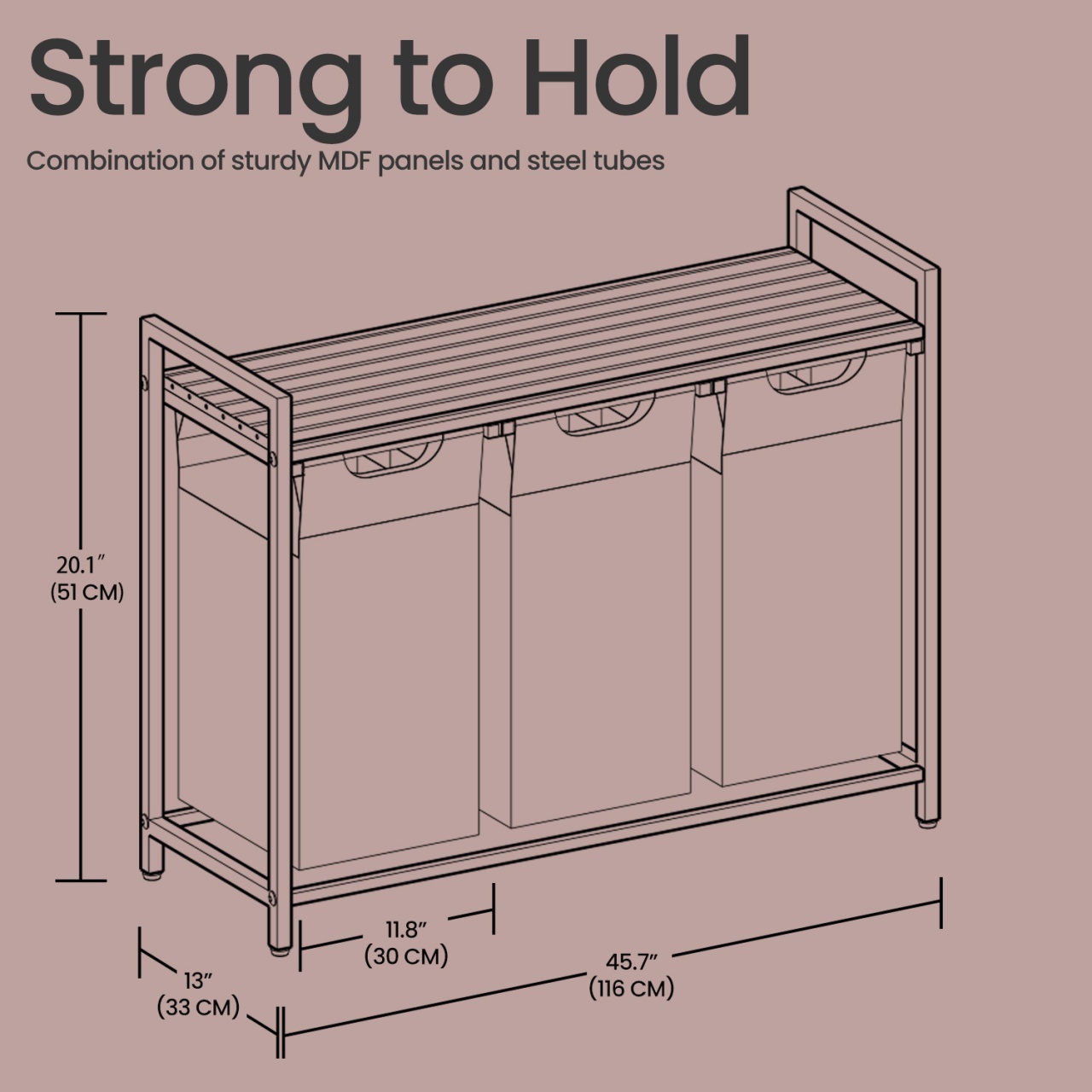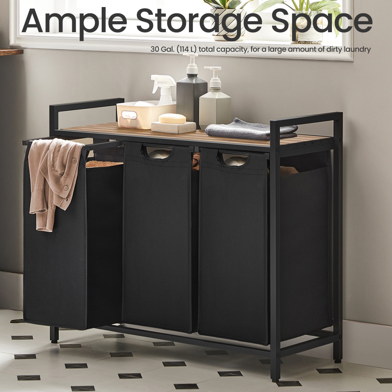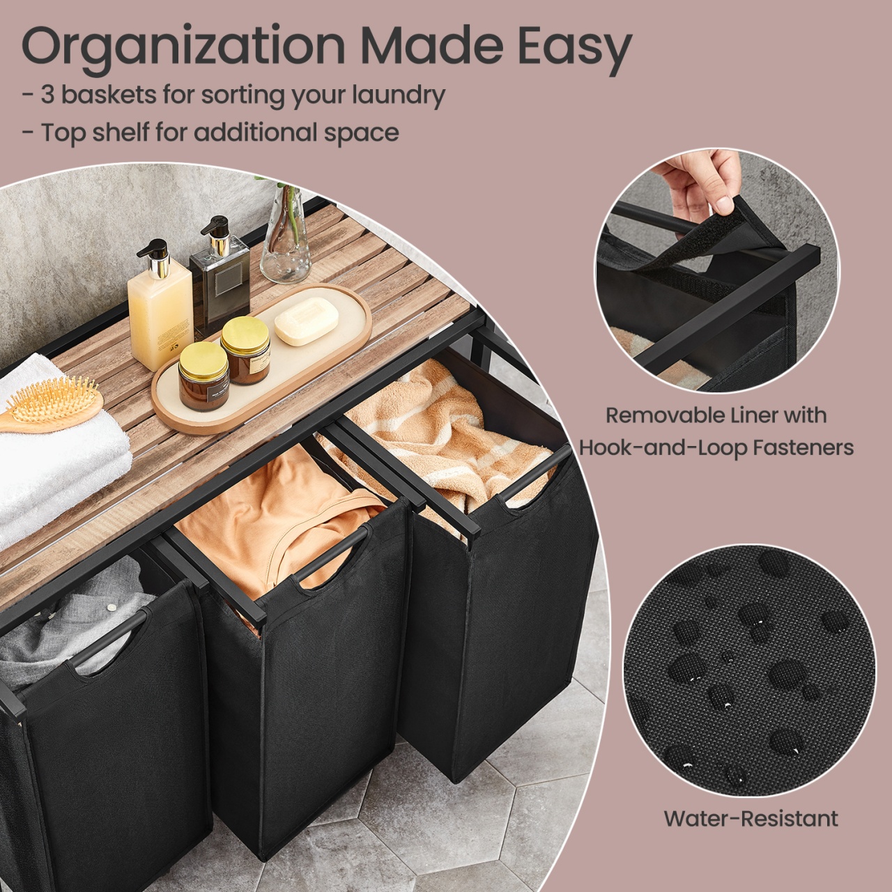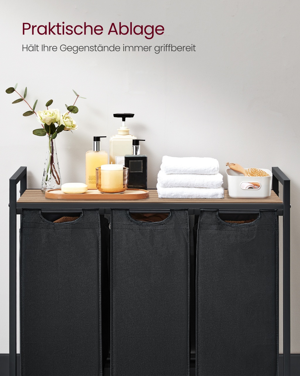 Coș de rufe Vigo, Negru — Sortare igienică și practică în 3 compartimente Design și materiale de calitate Un companion proaspăt și ordonat pentru baie sau spălătorie: finisaj vintage maro-negru, linie compactă și atemporală care se potrivește ușor într-un colț. Construcția combină Lemn MDF (MDF = Medium Density Fiberboard, adică fibră de densitate medie), panouri din Lemn PAL (Particleboard tradus ca Lemn PAL) și o structură din Metal , iar sacii detașabili sunt din material textil Oxford, ușor de manevrat. De asemenea, sertificarea FSC indică gestionare responsabilă a resurselor lemnoase (FSC = Forest Stewardship Council). Funcționalitate și organizare Gândește-te la rutina ta îmbunătățită: trei coșuri separate pentru sortare rapidă (fiecare cu dimensiuni 25 x 30 x 51 cm), o poliță practică pentru detergenți sau prosoape și o amprentă redusă la sol (92.5 x 33 x 72 cm). Acest sortator oferă 3 compartimente pentru sortare imediată, poliță utilă pentru accesoriile frecvente și saci detașabili pentru transport ușor spre mașina de spălat. Montaj și întreținere Montați ușor cu instrucțiuni ilustrare și piese clar etichetate; produsul include și kit de anti-răsturnare (2 x Anti-tilt protection) pentru stabilitate suplimentară. Curățarea se face simplu cu o lavetă moale pentru suprafețele din Lemn MDF și Lemn PAL, iar sacii textili pot fi îndepărtați pentru curățare și manevrare. Alte caracteristici practice: picioare reglabile pentru nivelare și accesorii de montaj incluse. Comandă acum și transformă-ți spațiul! Organizează-ți rutina zilnică cu stil: adaugă acest coș de rufe Vigo în coșul tău și bucură-te de o baie sau o spălătorie mai curată, mai ordonată și mai igienică. Detalii tehnice complete Dimensiuni și greutate Dimensiuni produs: 92.5 x 33 x 72 cm Greutate produs: 8.1 kg Capacitate maximă de susținere: 30 kg Materiale și caracteristici Material corp: Lemn MDF, Metal Material finisaj/tapițerie: Material textil Oxford Culoare: Negru Număr pachete: 1 Montaj și pachet Stare asamblare: Neasamblat Conținut pachet: 1 x Coș de rufe cu poliță, 2 x Protecții anti-răsturnare, Accesorii de montaj, Instrucțiuni Stil și origine Stil: Rustic Destinație recomandată: Baie