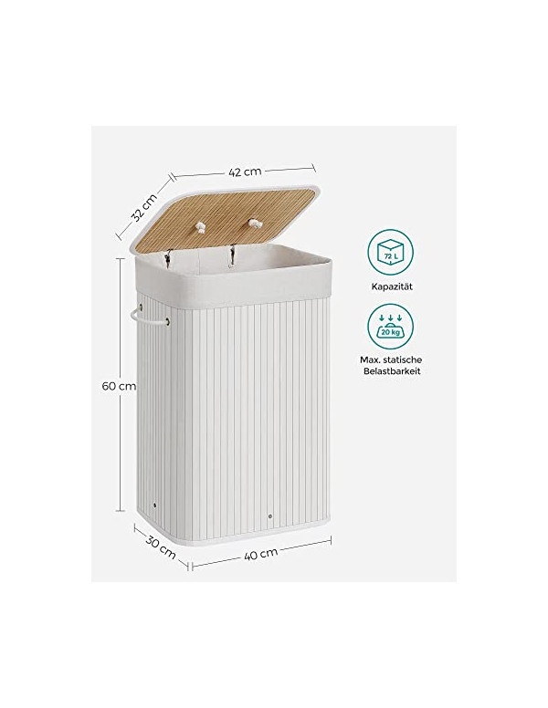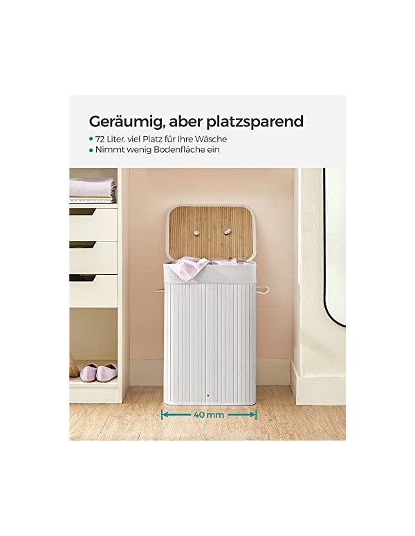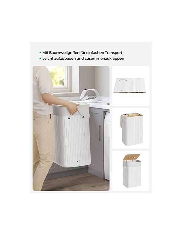 Descoperiți coșul pentru rufe Songmics, un accesoriu elegant și practic pentru orice cămin. Fabricat din bambus, acest coș alb nu doar că adaugă un strop de rafinament, dar este și extrem de ușor, având o greutate de doar 2.2 kg. Cu dimensiuni de 40 x 30 x 60 cm, este ideal pentru a păstra rufele organizate și la îndemână. Fie că îl folosiți în baie, dormitor sau spălătorie, coșul include instrucțiuni pentru o utilizare ușoară. Alegeți Songmics pentru un stil de viață ordonat și plin de eleganță!