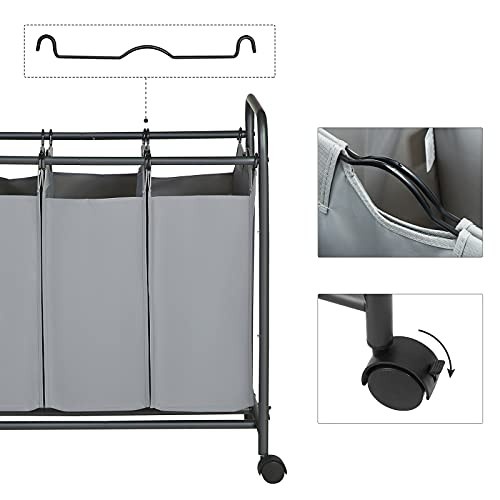 Păstrați rufele organizate cu coșul de rufe modular Songmics, dotat cu 3 saci detasabili de 44 de litri, ideali pentru sortarea hainelor în funcție de culoare sau material. Sacii din țesătură gri sunt ușor de transportat datorită mânerelor practice, iar cu cele 4 roți pivotante, mutarea acestuia la mașina de spălat devine o sarcină simplă. Calitatea materialelor a fost testată de TÜV, garantând siguranța utilizării. Acest coș inteligent vă ajută să evitați accidentele de spălare și să faceți procesul mai eficient.