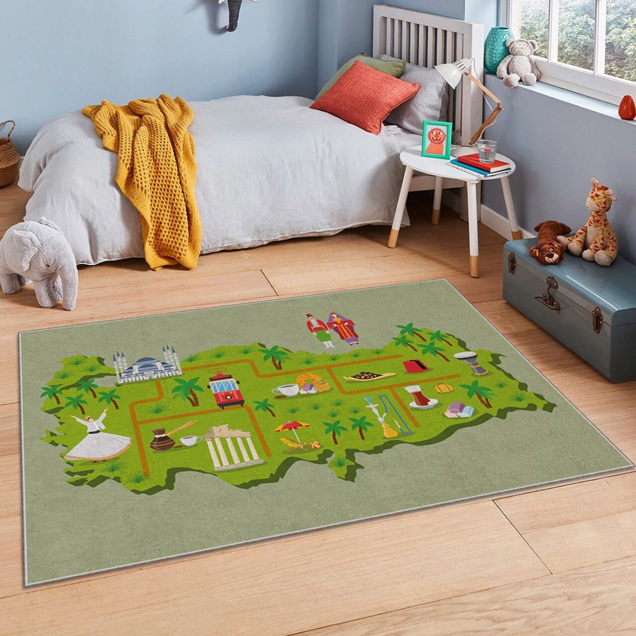 Covorul pentru copii Hmı Kdc-84, cu dimensiunile de 180 x 280 cm, aduce o notă de veselie în orice cameră. Realizat din țesătură catifea, acesta are o imprimare vibrantă, perfectă pentru a stimula imaginația celor mici. Partea inferioară este dotată cu puncte din pâslă anti-alunecare, asigurându-se astfel siguranța în utilizare. Buretele laminat dintre partea inferioară și materialul superior facilitează curățarea, iar caracteristica antibacteriană contribuie la un mediu mai sănătos. Cu o înălțime a firelor de 2 mm, covorul este atât confortabil, cât și practic.
