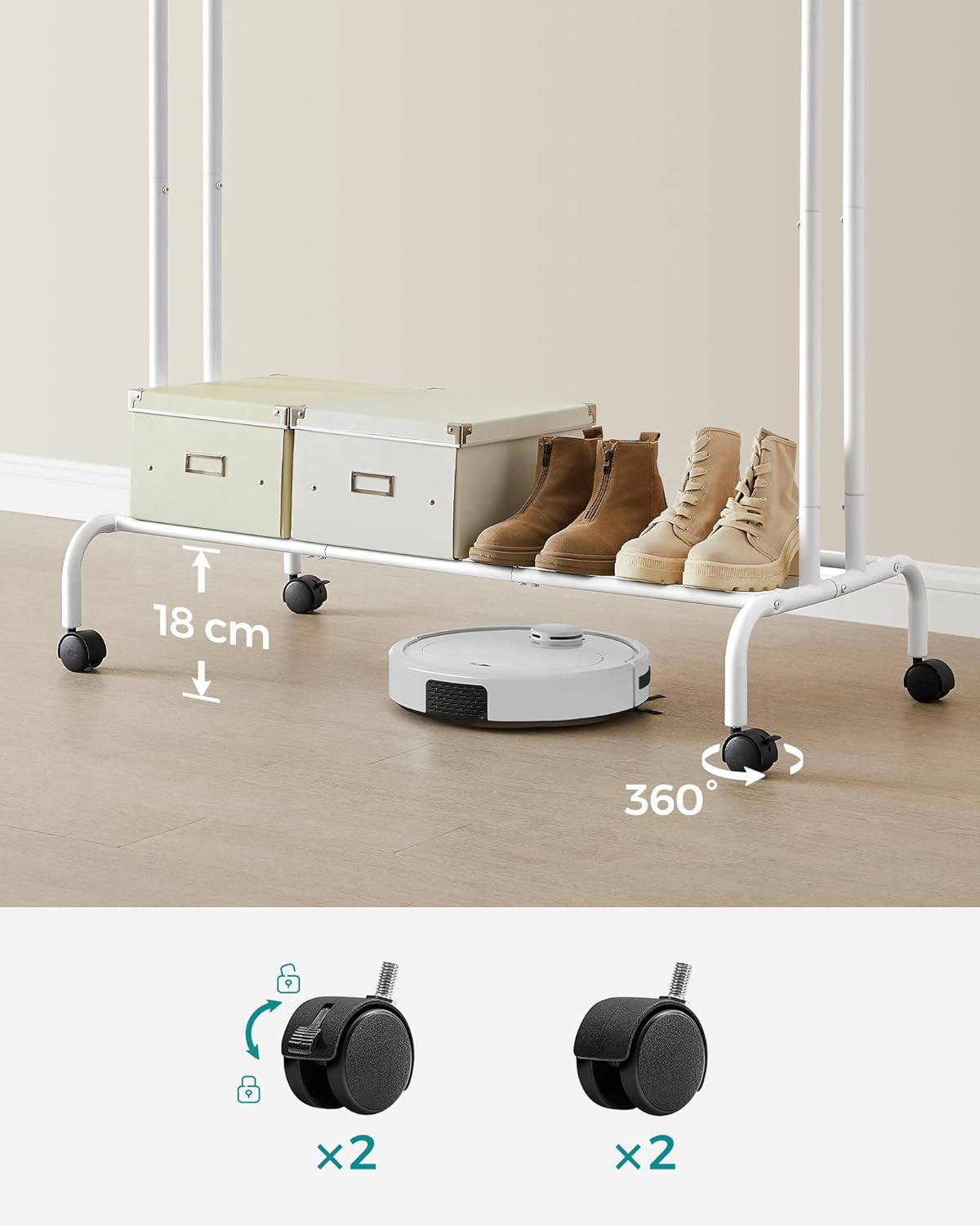 Umerașul mobil HASAR pe două rânduri, de culoare albă, este fabricat din oțel de înaltă calitate, având dimensiuni de 103 cm lățime, 52,5 cm adâncime și 155 cm înălțime. Cu o greutate de 5,7 kg, acesta poate susține o capacitate maximă de 100 kg, iar tija centrală suportă până la 30 kg. Raftul inferior poate susține 20 kg, iar cârligele laterale au o capacitate de 5 kg. Echipat cu două tije suspendate și un raft inferior, umerașul dispune de roți pentru transport ușor, dintre care două pot fi blocate. Se livrează dezasamblat.