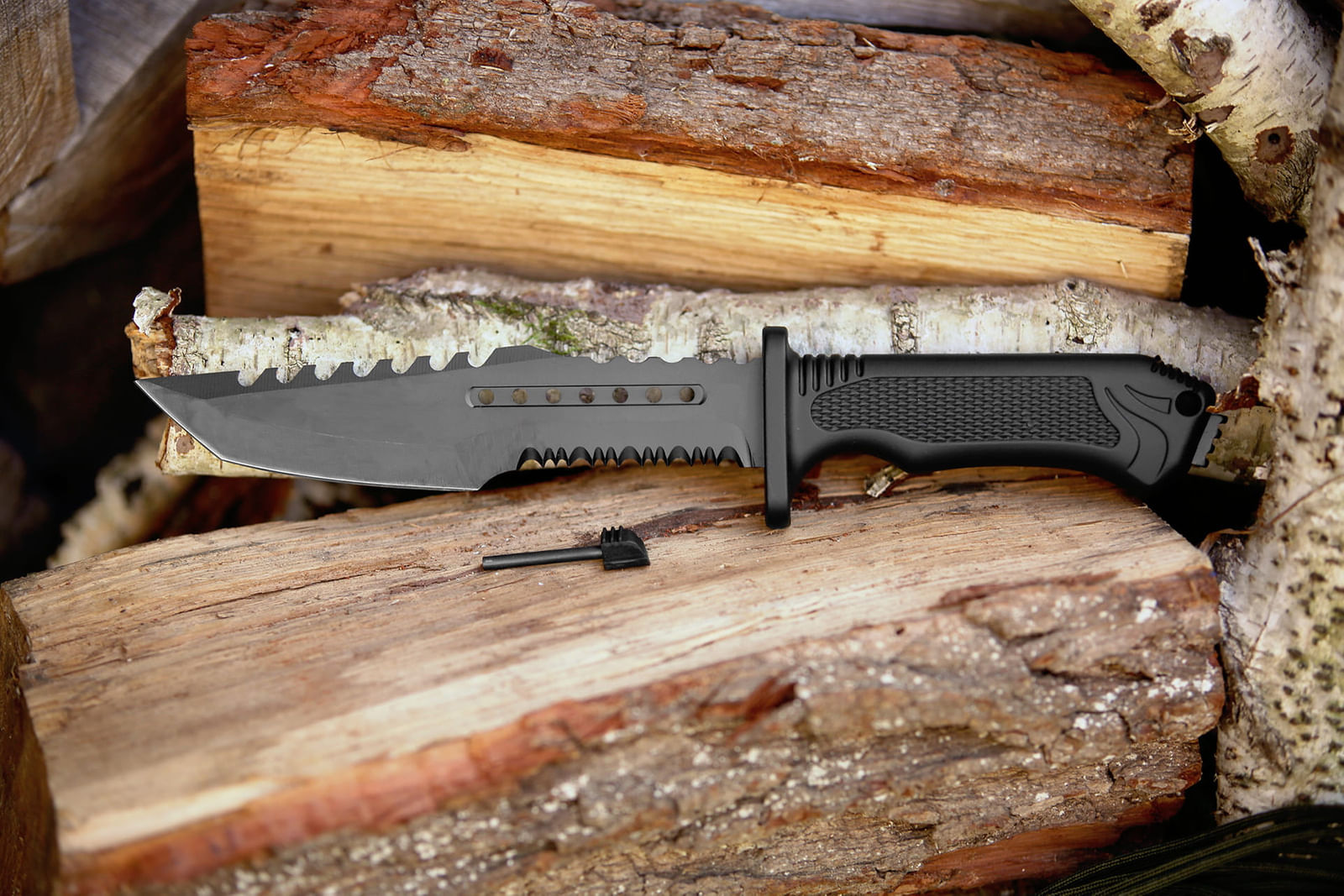 Cutit de vanatoare cu un design nou. Acest cutit este un instrument de incredere care va fi perfect pentru orice manevre tactice, supravietuire sau vanatoare. Va fi un cadou perfect pentru un vanator, colectionar sau orice pasionat de drumetii. Cutitul are o constructie Full Tang care maximizeaza rezistenta la orice daune. Cutitul a fost realizat din otel inoxidabil 440, care a fost acoperita suplimentar cu un strat eficient culoarea neagra pentru a preveni coroziunea. Partea unica a acestui cutit este manerul ce este dintr-un material mai aparte, plastic, durabil si rezistent la orice fel de conditii meteorologice. Este inclusa o teaca tactica care poate fi atasata la cureaua pantalonilor tai. Aditional: amnar (cremene) inclus la baza manerului si un spargator de geamuri. Date tehnice: Tip cutit: cu lama fixa Profilul lamei: drept Tip lama: neteda Lungime totala: 305 mm Lungimea lamei: 175 mm Lungime maner: 130 mm Latimea lamei: 40 mm Grosimea lamei: 3.5 mm Greutate: 200 g Material lamei: otel inoxidabil 420 Material maner: plastic Teaca tactica inclusa.