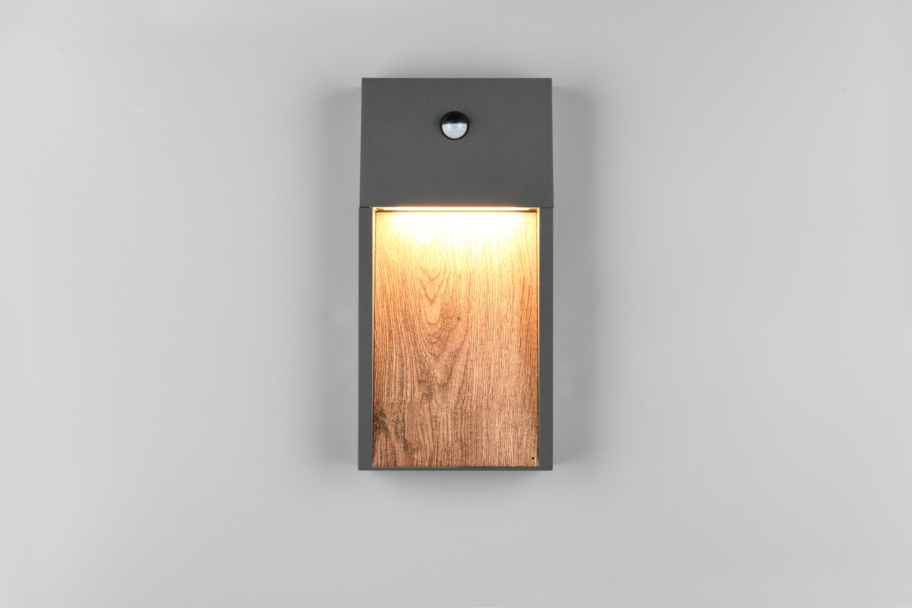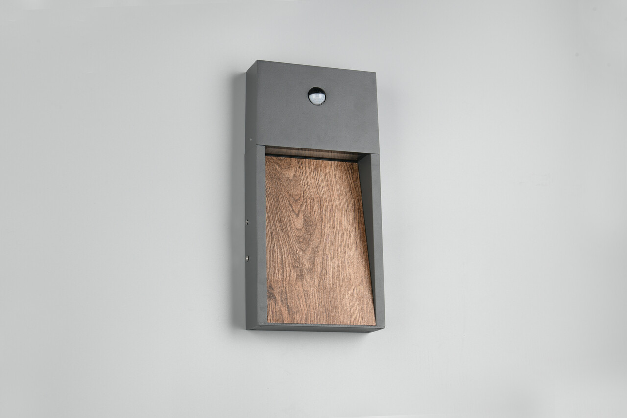 Aplica de perete pentru exterior Salmon TRIO, cu dimensiuni de 16.5x33 cm și putere de 11W, oferă un design elegant din aluminiu antracit și lemn natural, perfectă pentru a ilumina intrarea sau fațada casei. Echipată cu senzor de mișcare, asigură o protecție suplimentară împotriva efracției, iluminând zonele greu vizibile. Gradul de protecție IP44 o face versatilă, ideală și pentru subsoluri sau garaje. Tehnologia LED modernă garantează o durată de viață de 30.000 de ore, cu un flux luminos de 1200 lumeni și o temperatură a culorii de 3000K, oferind o lumină caldă și plăcută.