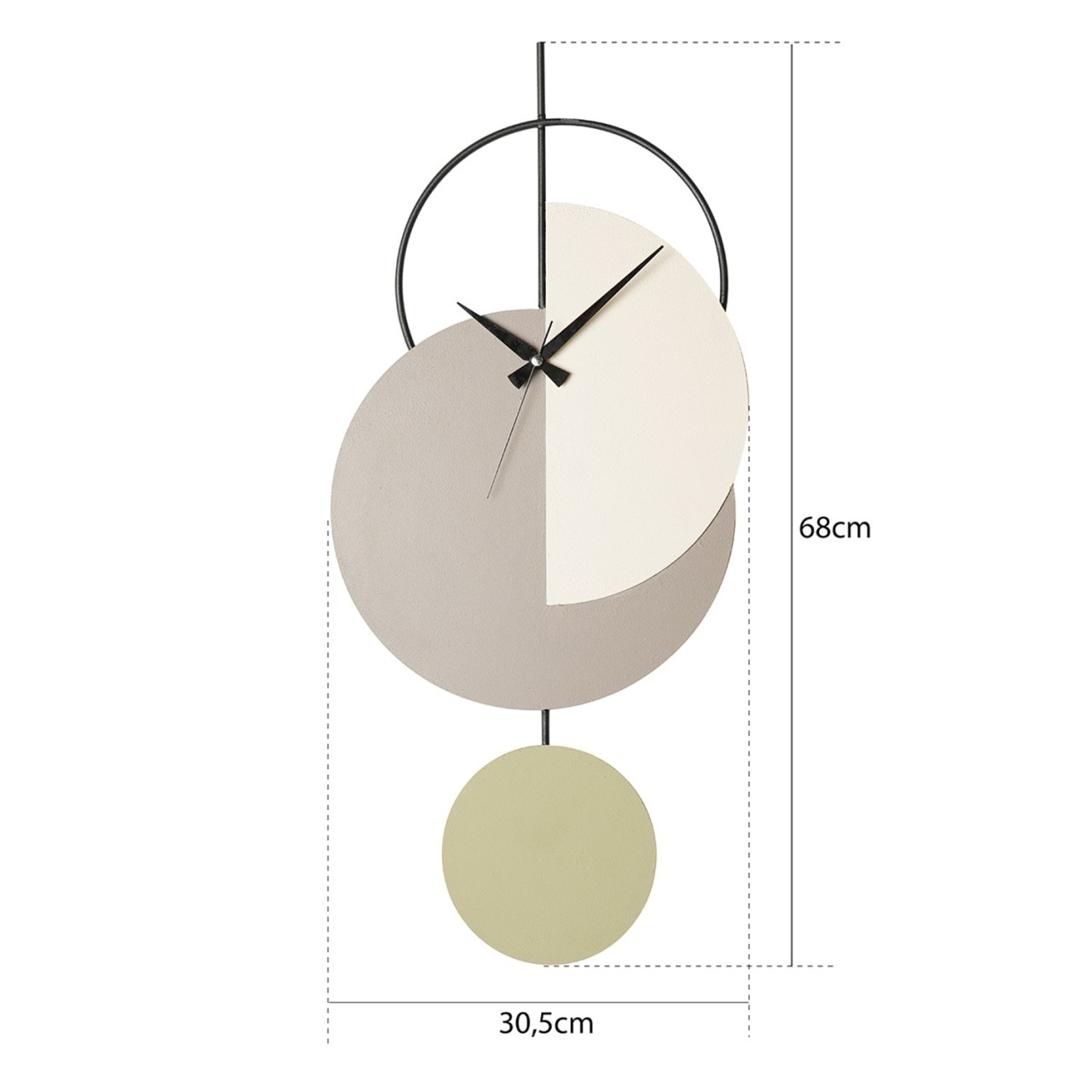 100% metal Diametru: 68 cm Grosime: 1,5 mm Dimensiune: 68 x 31 cm Tip baterie: baterie nu este inclusă Funcționează cu 1 baterie AA Produsul nostru este pictat manual/mecanism silentios