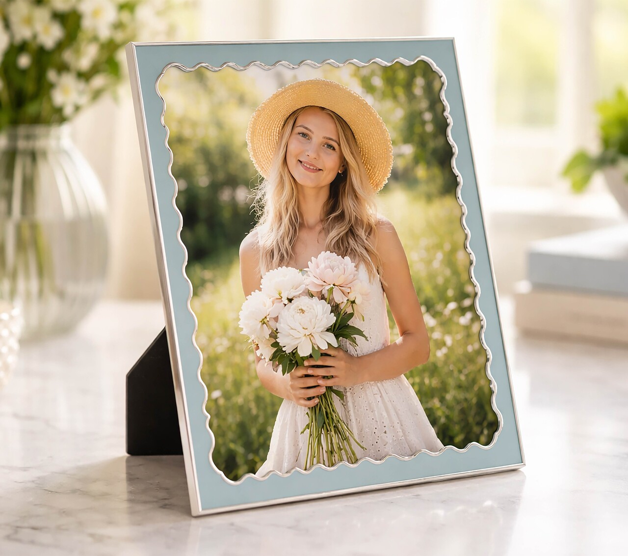 Un model proaspat si delicat, cu margine bleu deschis si profil ondulat. O rama cu gust romantic si aerat.Dimensiuni fotografie: 20x25 cm
