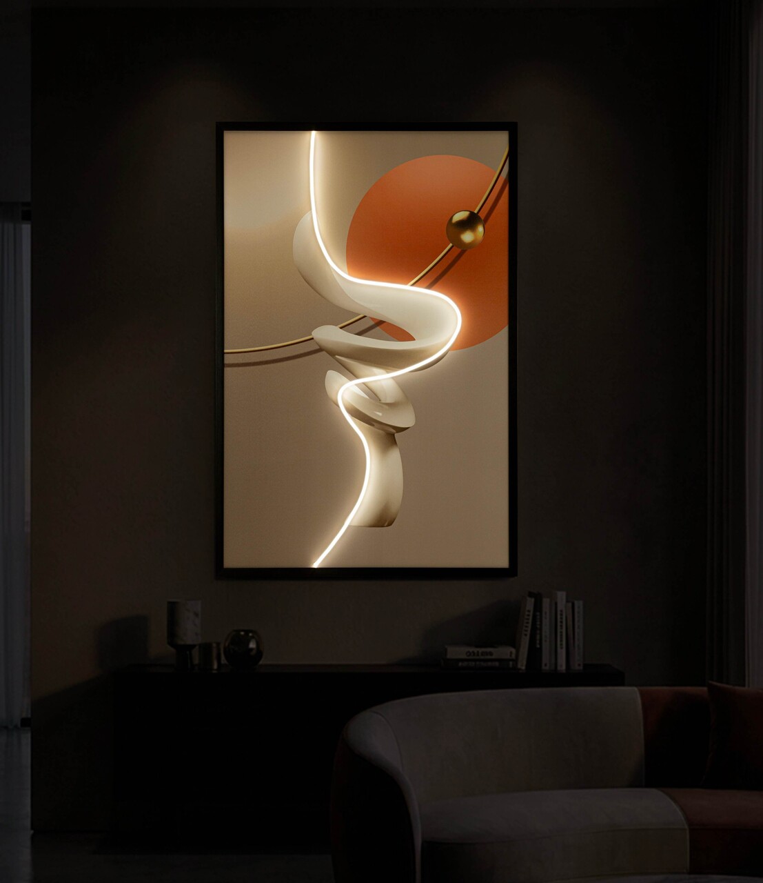 Linii dinamice si lumini LED care evidentiaza armonia abstracta a compozitiei. O lucrare ce aduce stil, modernitate si un accent scenografic locuintei.Tablou imprimat pe canvasPrevazut cu lumini LEDCompozitie material: canvas, plastic, MDF.