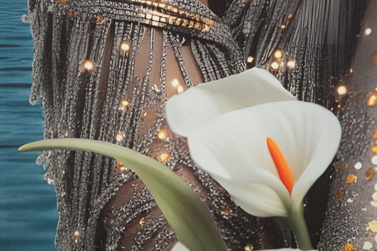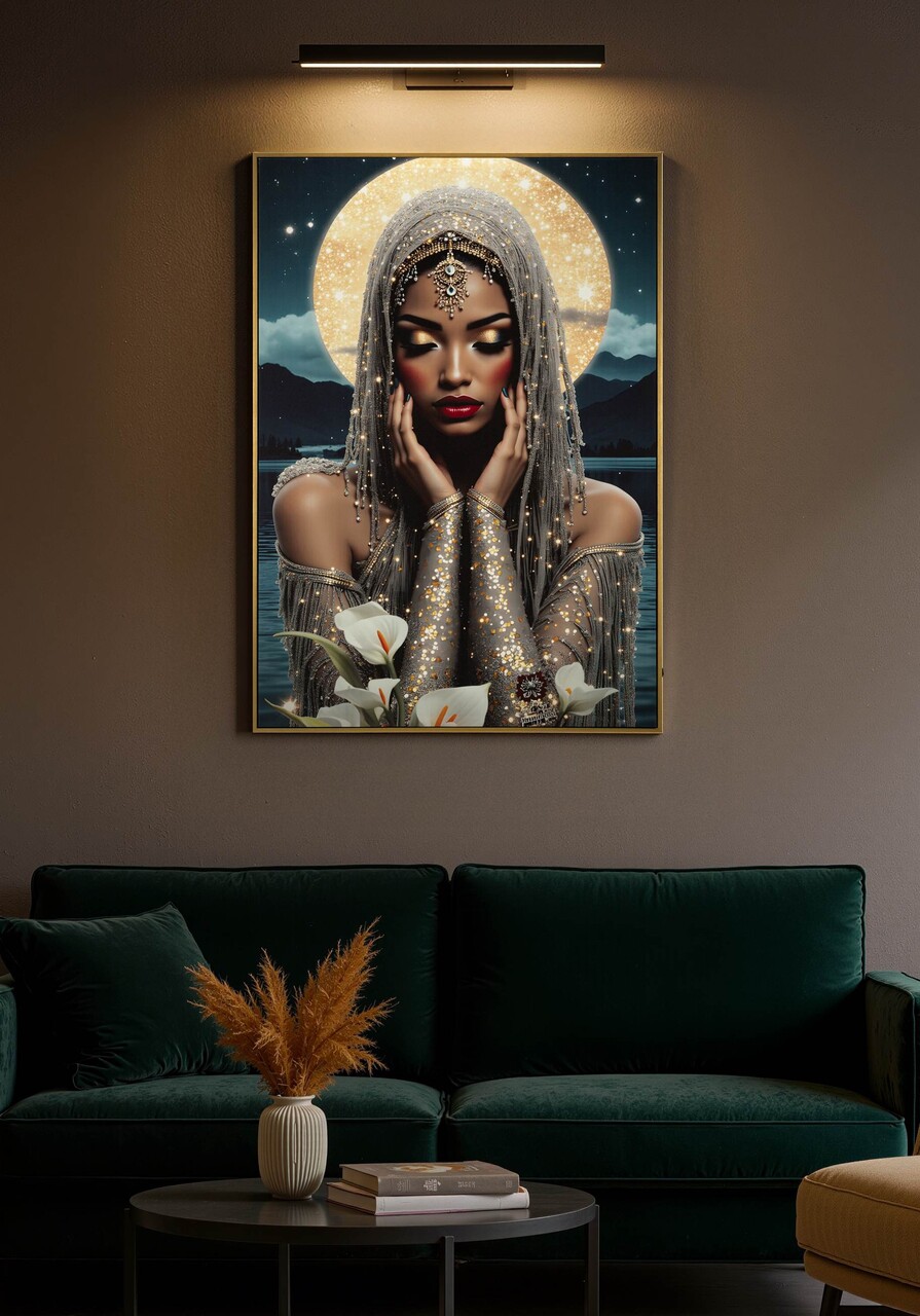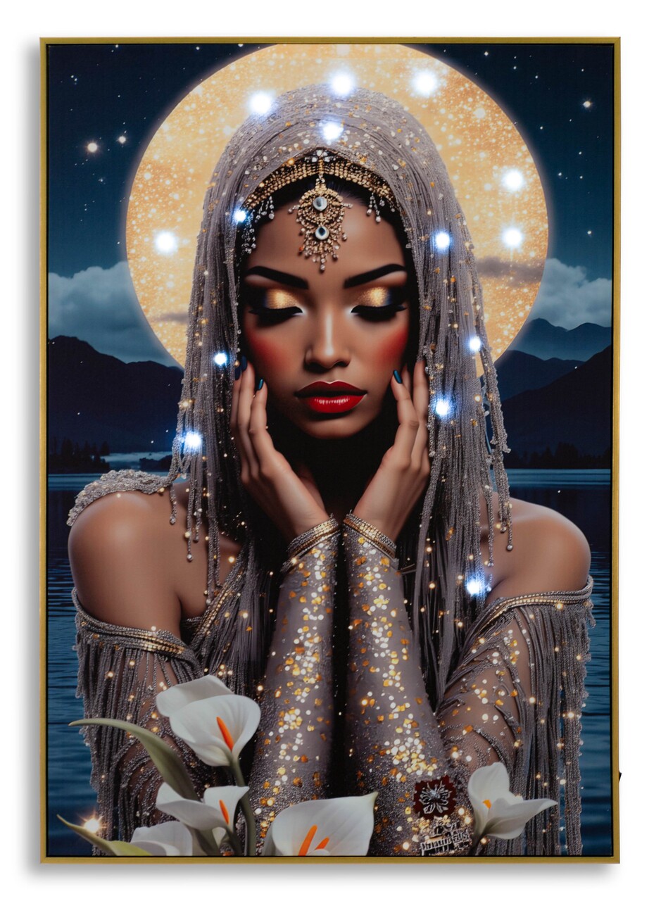 Un portret feminin luminos si fermecator, imbogatit cu detalii LED care ii amplifica aura mistica. Un tablou ce imbina arta si lumina, transformand orice spatiu intr-un loc plin de farmec.Tablou imprimat pe canvasPrevazut cu lumini LEDFunctioneaza cu 2 baterii de tip AA, neincluse.Compozitie material: lemn de brad, canvas, plastic.