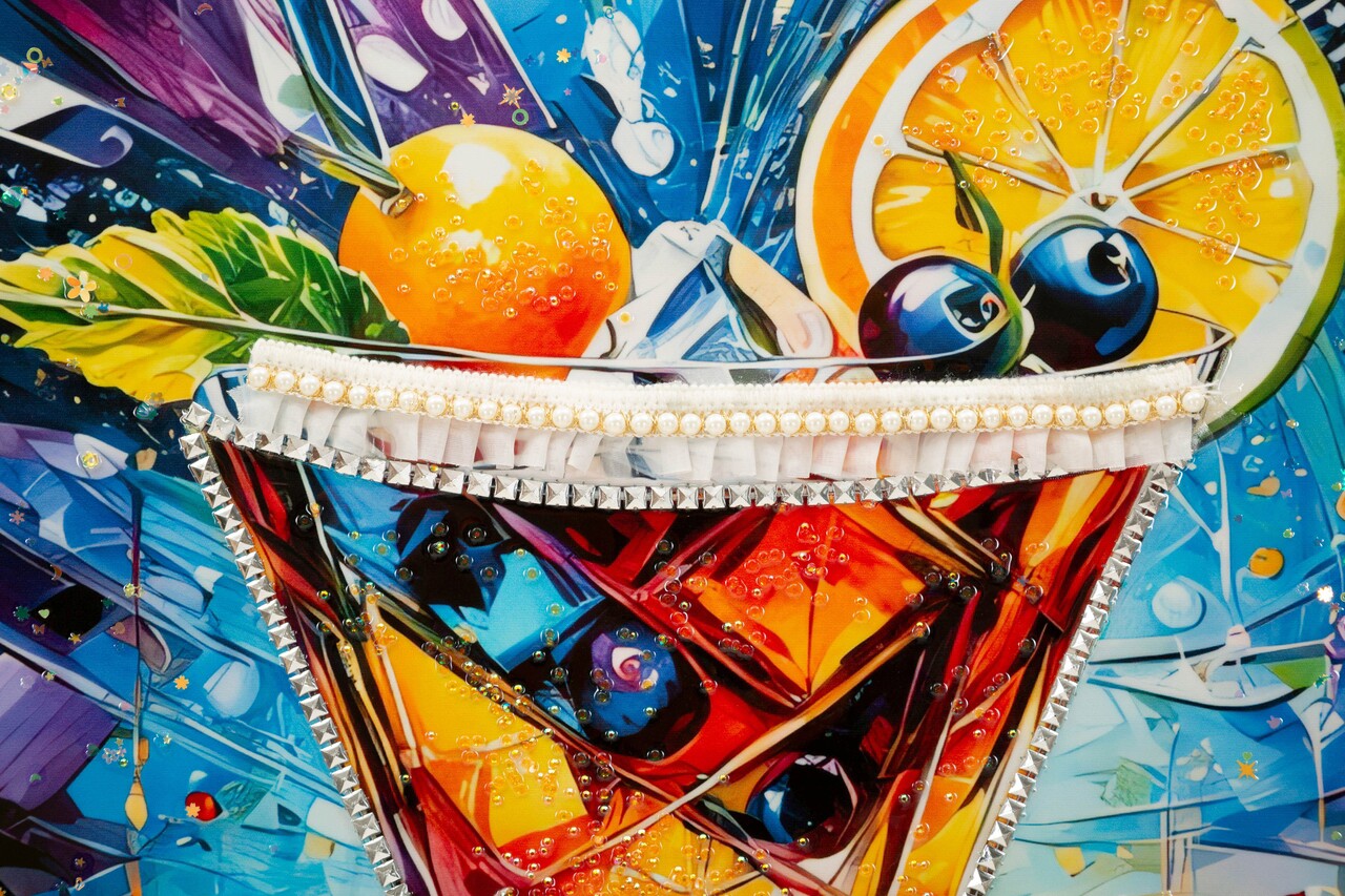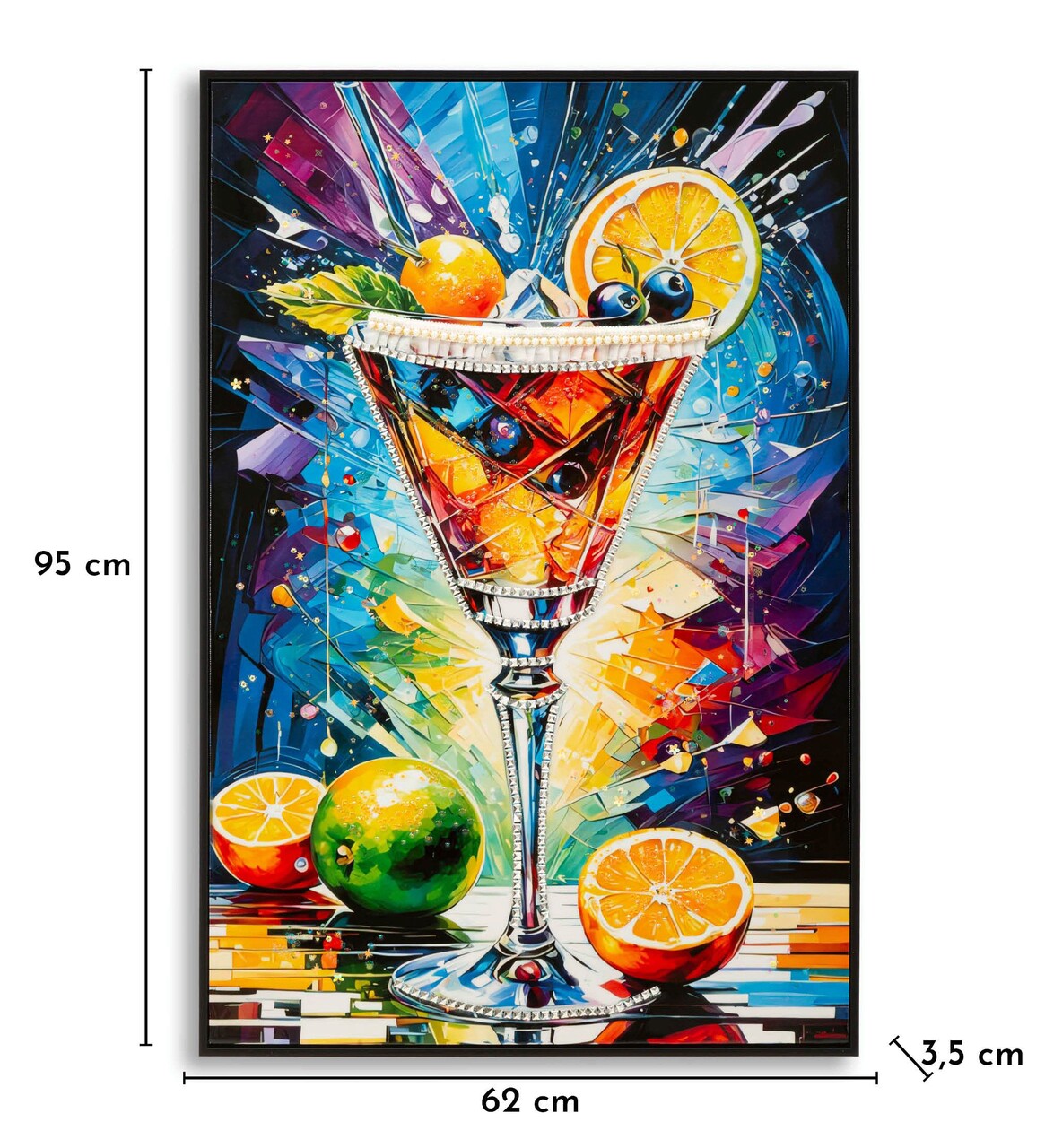 O explozie de culori vibrante intr-un pahar de cocktail, care transmite energie si buna dispozitie. Un accent modern si jucaus pentru spatii tinere si dinamice.Tablou imprimat pe canvasCompozitie material: lemn de brad, canvas, plastic.