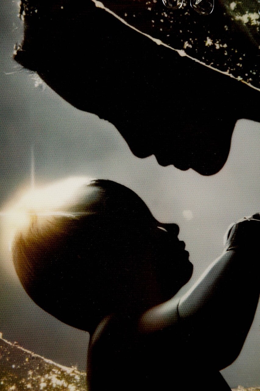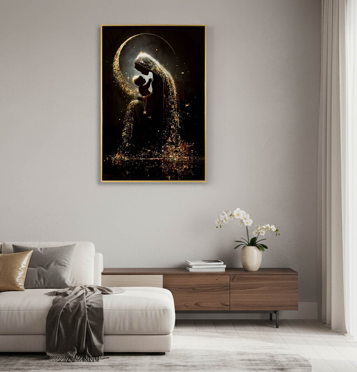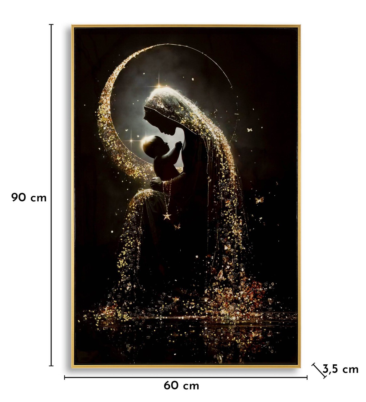 O imbratisare materna transformata in magie de cascade de lumina aurie. O lucrare ce transmite iubire, protectie si un profund sentiment de intimitate.Tablou imprimat pe canvasCompozitie material: lemn de brad, canvas, plastic.