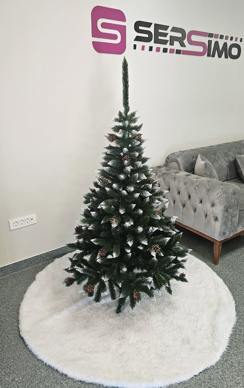 Bradul artificial Christmas Deluxe by Sersimo Danemark 2D, cu o înălțime de 150 cm, aduce magia Crăciunului în casa ta. Cu un diametru de 100 cm, acesta dispune de un suport metalic și este îmbrăcat în zăpadă pe vârfuri, conferindu-i un aspect feeric. Decorat cu conuri naturale, bradul oferă un aer autentic și cald, perfect pentru momentele de familie. Construcția sa robustă, densitatea mare a ramurilor și distribuția uniformă a acelor asigură un aspect plăcut, iar posibilitatea de modelare a crenguțelor îți permite să îl personalizezi după bunul plac.