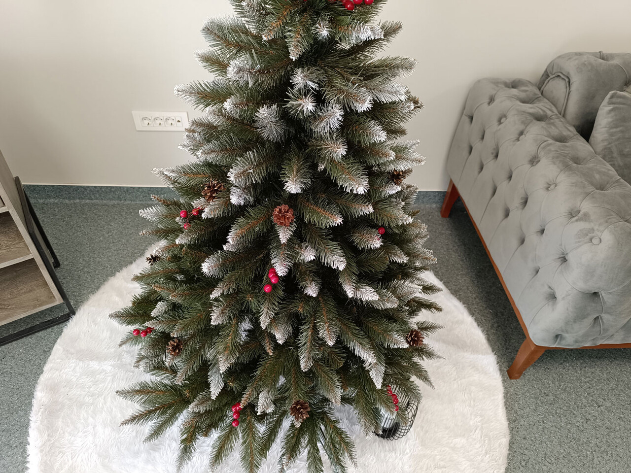 Bradul artificial Christmas Deluxe by Sersimo, model Frasin de Munte, are o înălțime de 150 cm și un diametru de 95 cm, fiind dotat cu un suport metalic. Acesta prezintă un aspect realist, cu ramuri dense și ace care imită perfect bradul natural, având inclusiv decoruri de zăpadă și merisoare roșii. Designul său permite modelarea crengilor în diverse forme, iar distribuția uniformă a acelor asigură un efect vizual atrăgător, fără goluri. Greutatea de 5.7 kg și materialele de calitate garantat durabilitatea, făcându-l alegerea ideală pentru a crea o atmosferă caldă și festivă în orice interior.
