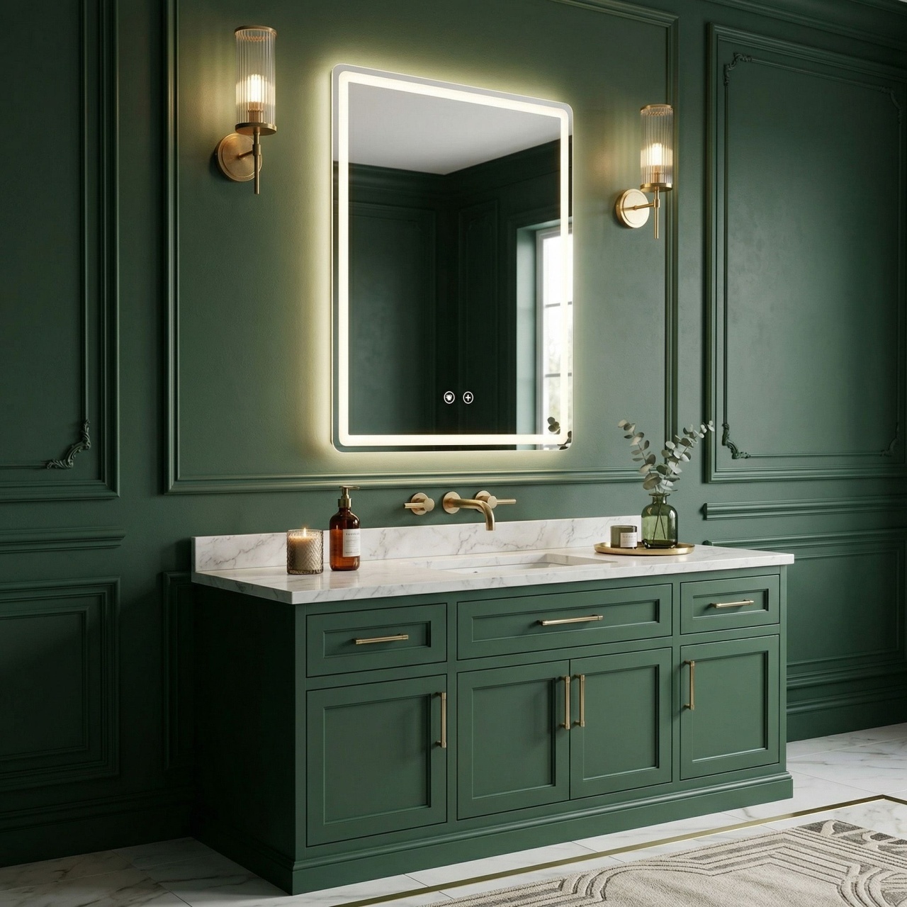 Oglinzi de baie LED cu touch și dezaburire, variate în diferite forme, modele & culori, în tendințe actuale. Funcționalitate modernă, dar și estetică plăcută pentru baia de acasă sau birou.
