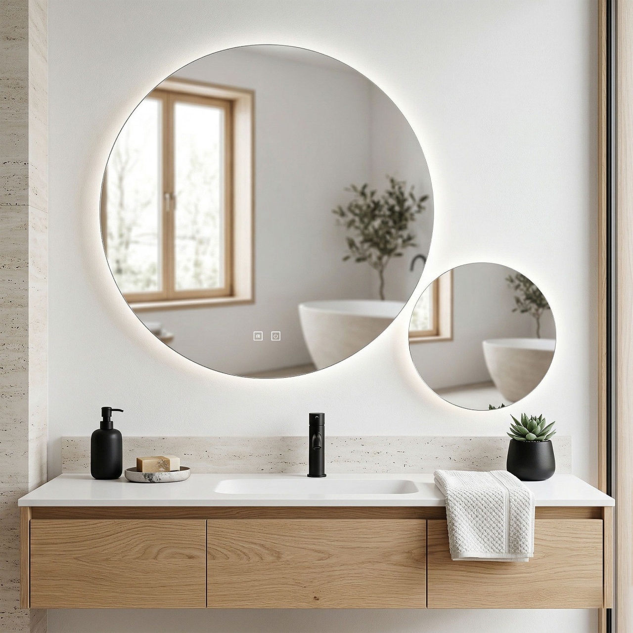 Oglinzi de baie LED cu touch și dezaburire, variate în diferite forme, modele & culori, în tendințe actuale. Funcționalitate modernă, dar și estetică plăcută pentru baia de acasă sau birou.