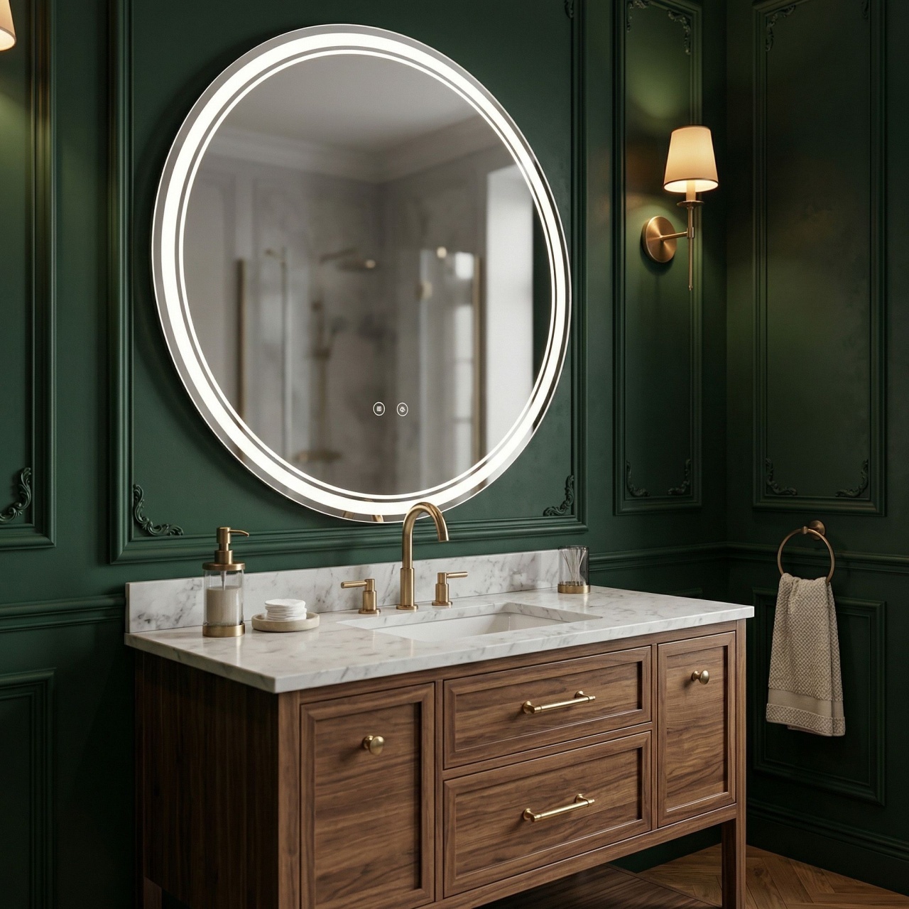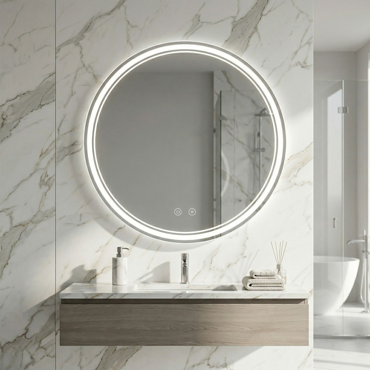 Oglinzi de baie LED cu touch și dezaburire, variate în diferite forme, modele & culori, în tendințe actuale. Funcționalitate modernă, dar și estetică plăcută pentru baia de acasă sau birou.