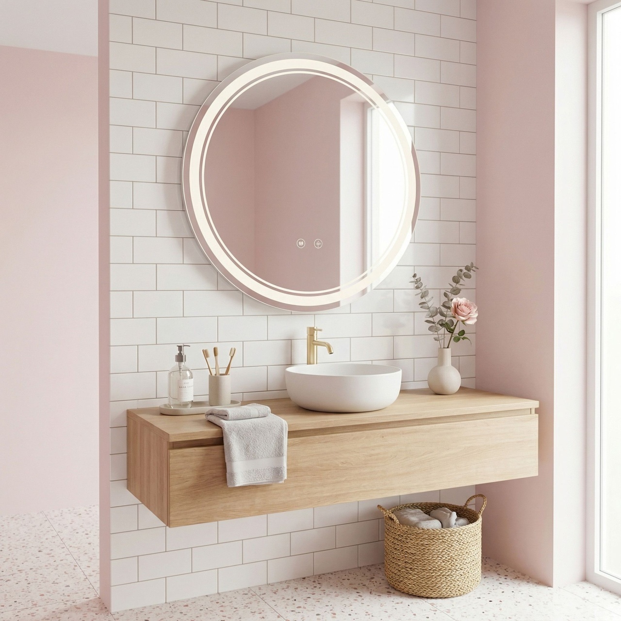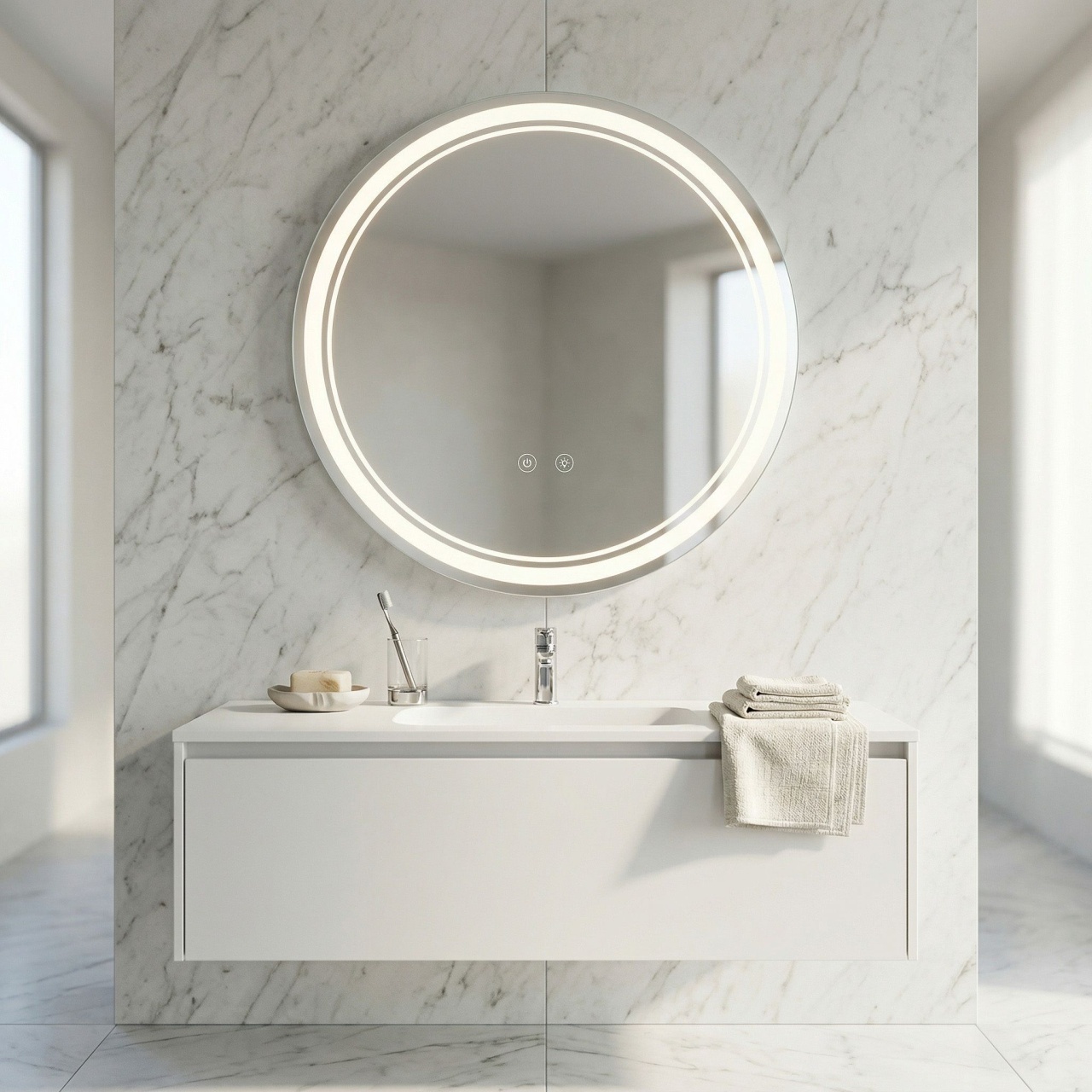 Oglinzi de baie LED cu touch și dezaburire, variate în diferite forme, modele & culori, în tendințe actuale. Funcționalitate modernă, dar și estetică plăcută pentru baia de acasă sau birou.