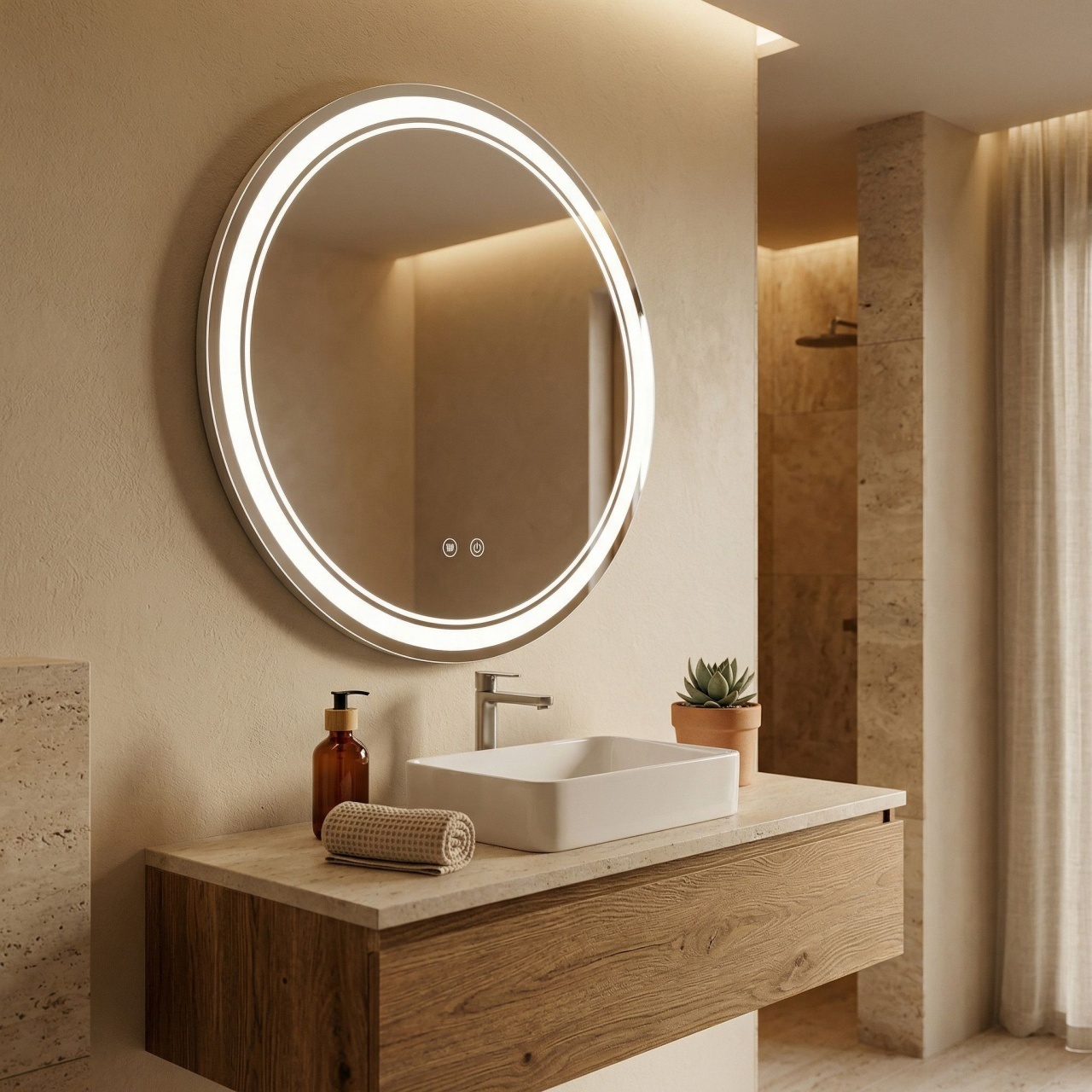 Oglinzi de baie LED cu touch și dezaburire, variate în diferite forme, modele & culori, în tendințe actuale. Funcționalitate modernă, dar și estetică plăcută pentru baia de acasă sau birou.