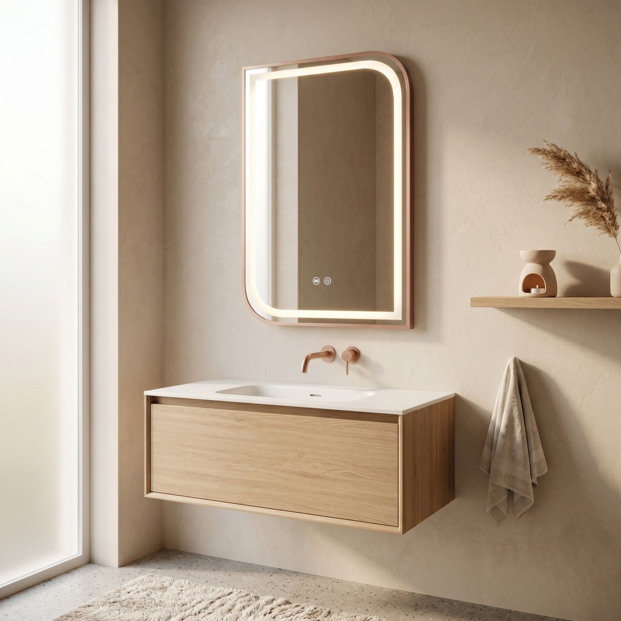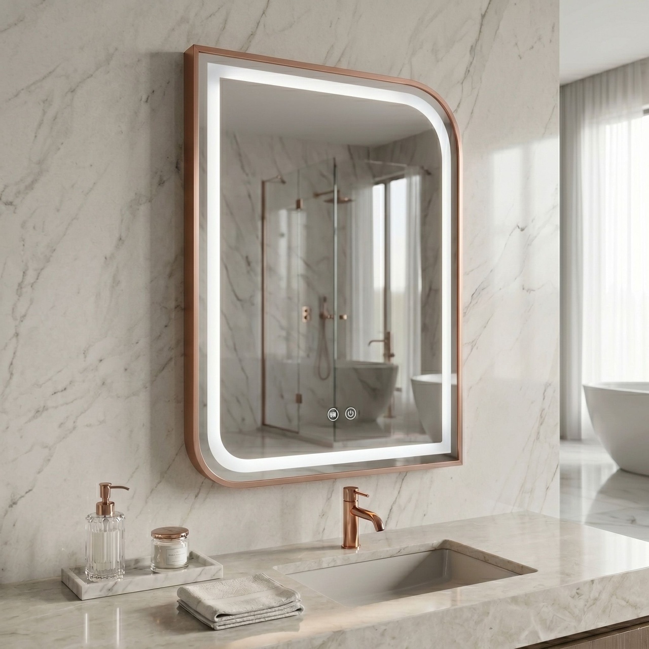 Oglinzi de baie LED cu touch și dezaburire, variate în diferite forme, modele & culori, în tendințe actuale. Funcționalitate modernă, dar și estetică plăcută pentru baia de acasă sau birou.