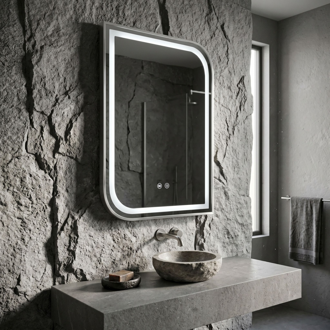Oglinzi de baie LED cu touch și dezaburire, variate în diferite forme, modele & culori, în tendințe actuale. Funcționalitate modernă, dar și estetică plăcută pentru baia de acasă sau birou.