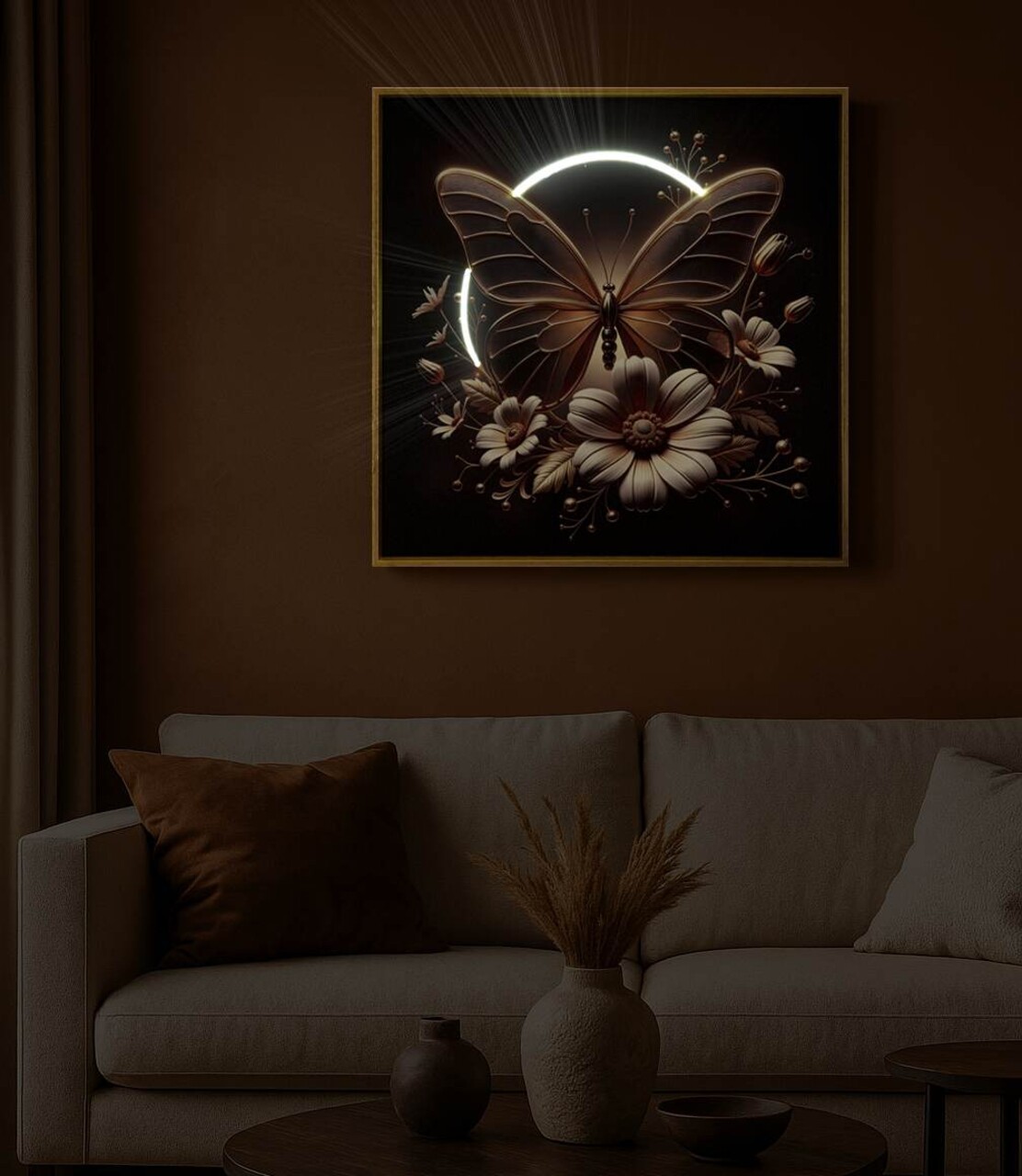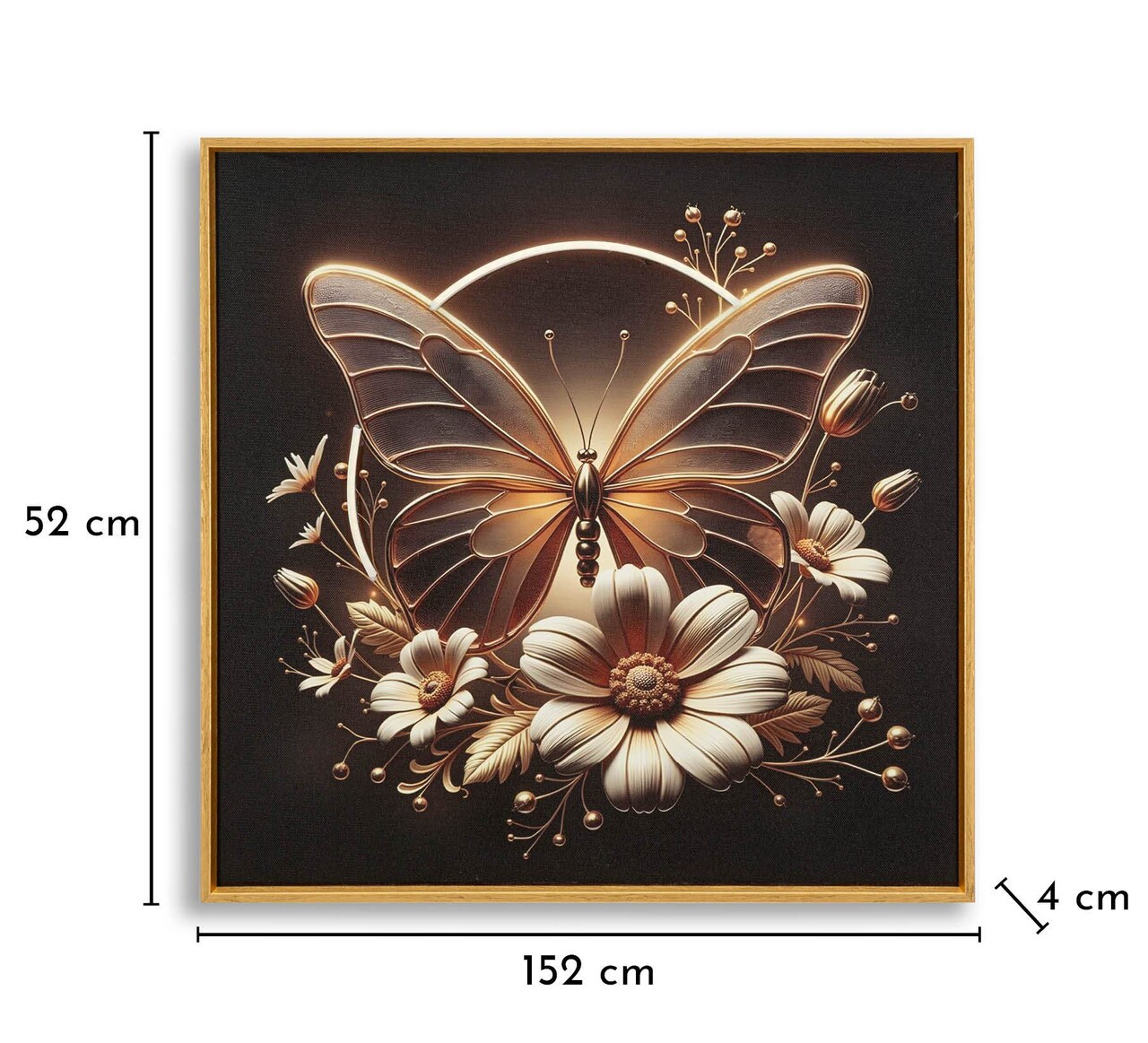 Un fluture auriu care prinde viata datorita luminii LED integrate, asezat delicat pe flori. Simbol al transformarii si al lejeritatii, aduce un accent magic si luminos spatiilor.Tabloul functioneaza cu cablu USB, adaptorul de priza nu este inclus.Imprimat pe canvas.Prevazut cu lumini LED.Compozitie material: lemn de brad, canvas, plastic.