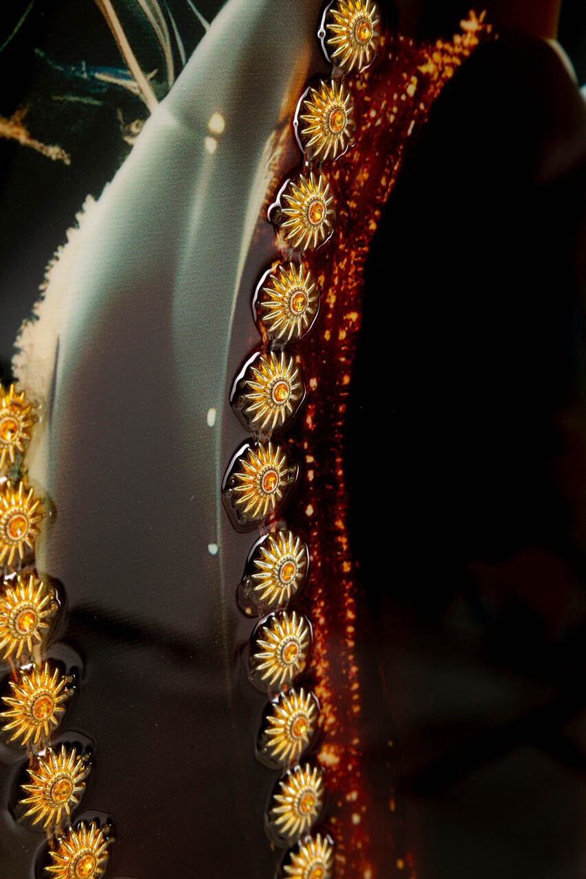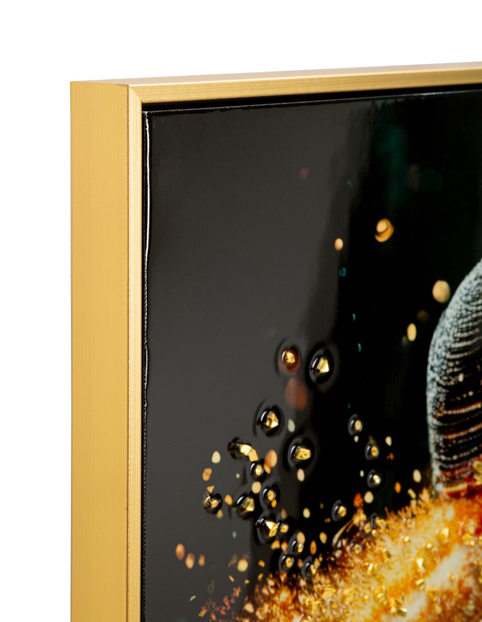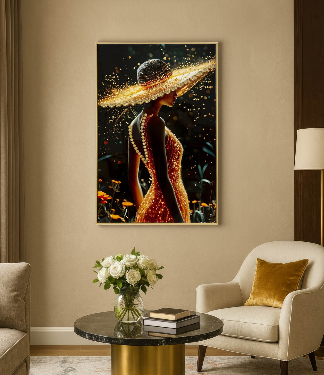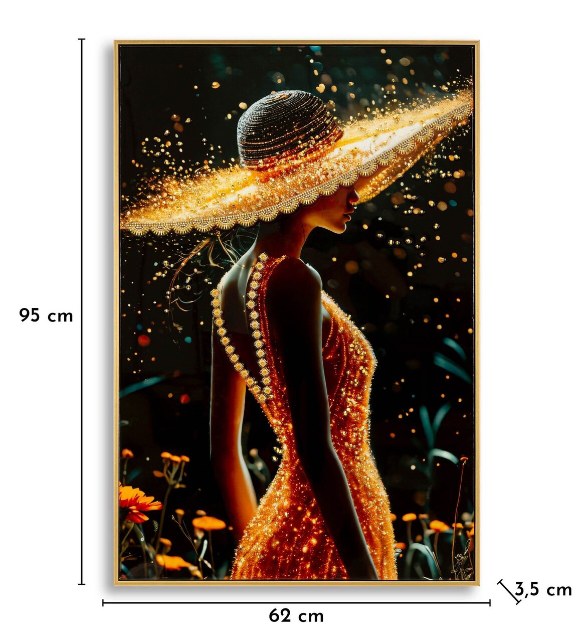 O silueta feminina eleganta, luminata de accente aurii care invalui scena. Un tablou ce exprima farmec, glam si un strop de magie nocturna.Tablou imprimat pe canvasCompozitie material: lemn de brad, canvas, plastic.
