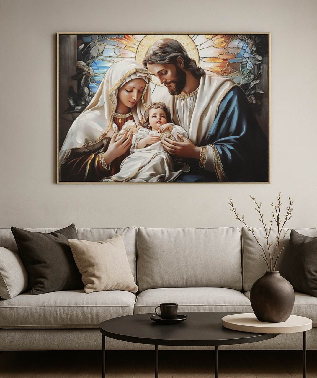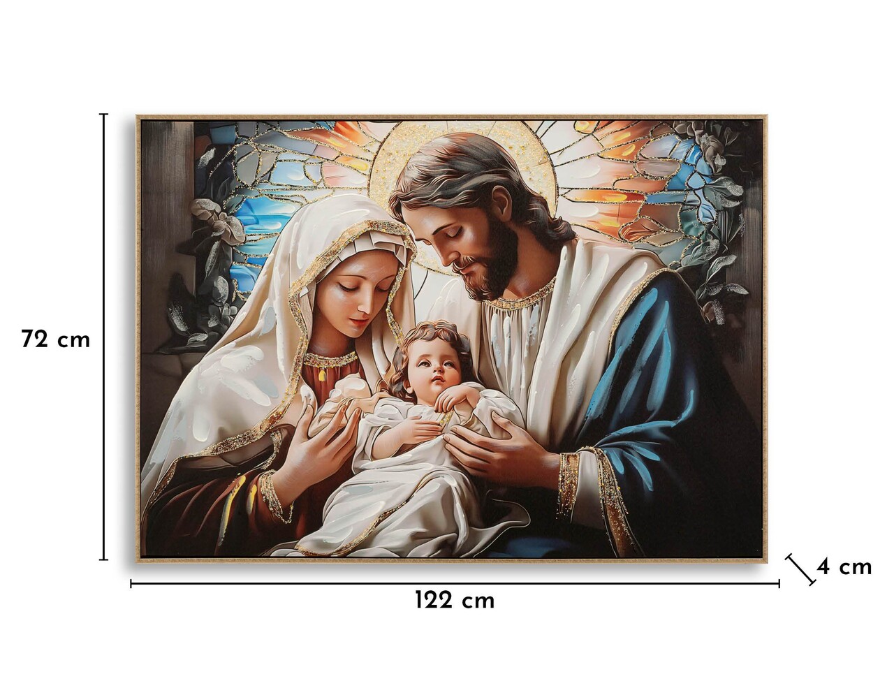 O imagine sacra in culori calde si luminoase, simbol al pacii si al credintei. Perfecta pentru a crea o atmosfera primitoare si plina de semnificatie.Tablou imprimat pe canvasCompozitie material: lemn de brad, canvas, plastic.