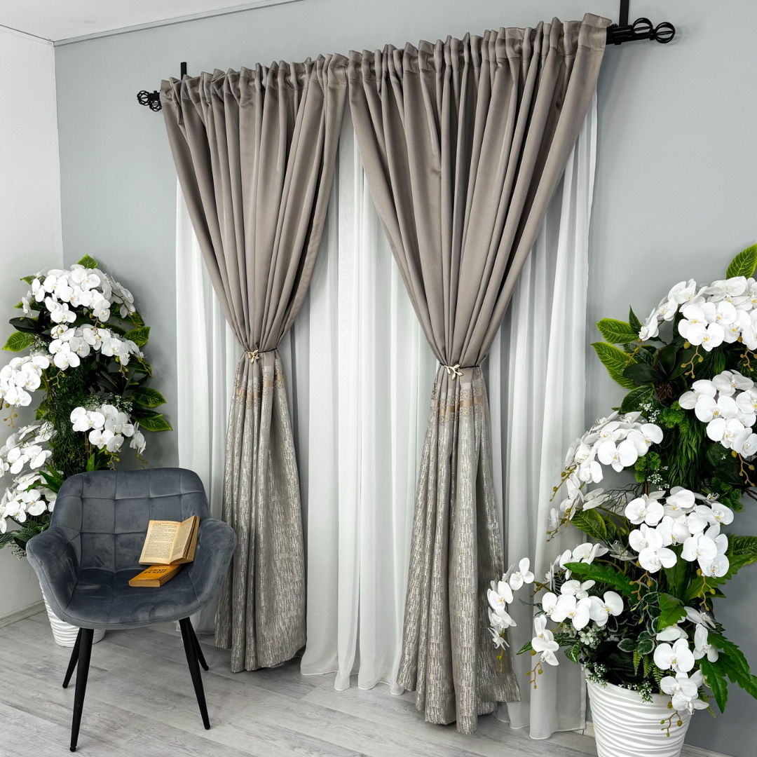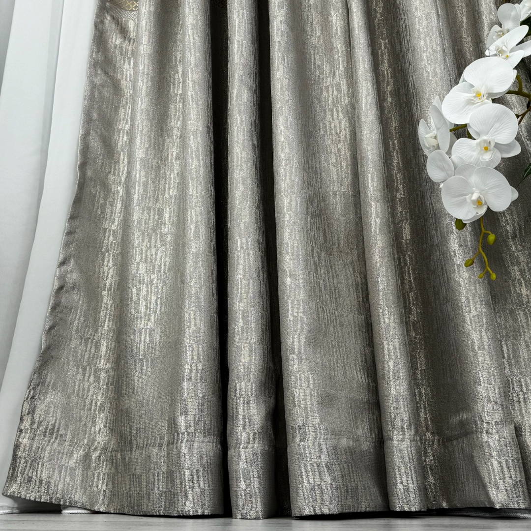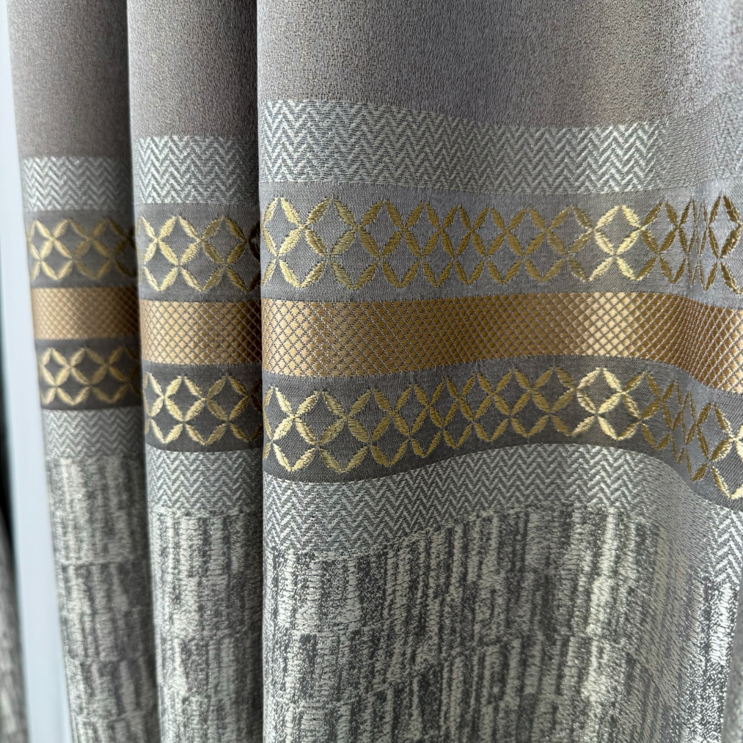 Setul de 2 bucati Draperie Simplicity tip panou Grej cu Gri reprezinta alegerea perfecta pentru a aduce eleganta si rafinament in orice incapere. Confecționate din material de inalta calitate, aceste draperii ofera o textura moale si bogata, aducand un sentiment de lux si sofisticare. Cu detaliile aurii metalizate, aceste draperii atrag atentia si confera un look opulent si glamour. Pot fi personalizate pe dimensiunile dorite de client si se pot intretine usor la 30°C. Transforma-ti spatiul intr-un sanctuar al elegantei cu acest set de draperii rafinate!