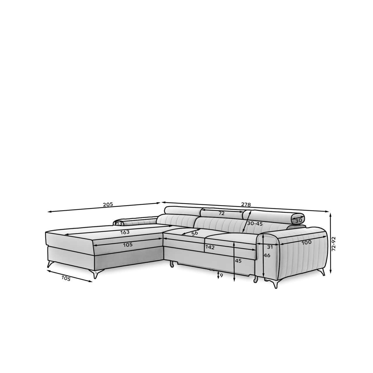 Colțarul extensibil Grayson pe stânga, cu un design modern din Velvetmat 25, oferă o combinație perfectă între eleganță și funcționalitate. Cu dimensiunile de 278x205x92 cm, este ideal pentru relaxare și odihnă. Șezutul din spumă T30 și HR asigură confort și durabilitate, iar funcția de dormit, cu o suprafață generoasă de 125x216 cm, se extinde ușor prin mecanismul tip „delfin”. Lada de depozitare integrată este perfectă pentru organizarea lenjeriei de pat. Tetierele reglabile și spătarul conturat completează confortul, făcând din Grayson o alegere excelentă pentru orice locuință. Produsul este personalizabil, iar montajul este simplu, cu instrucțiuni incluse.