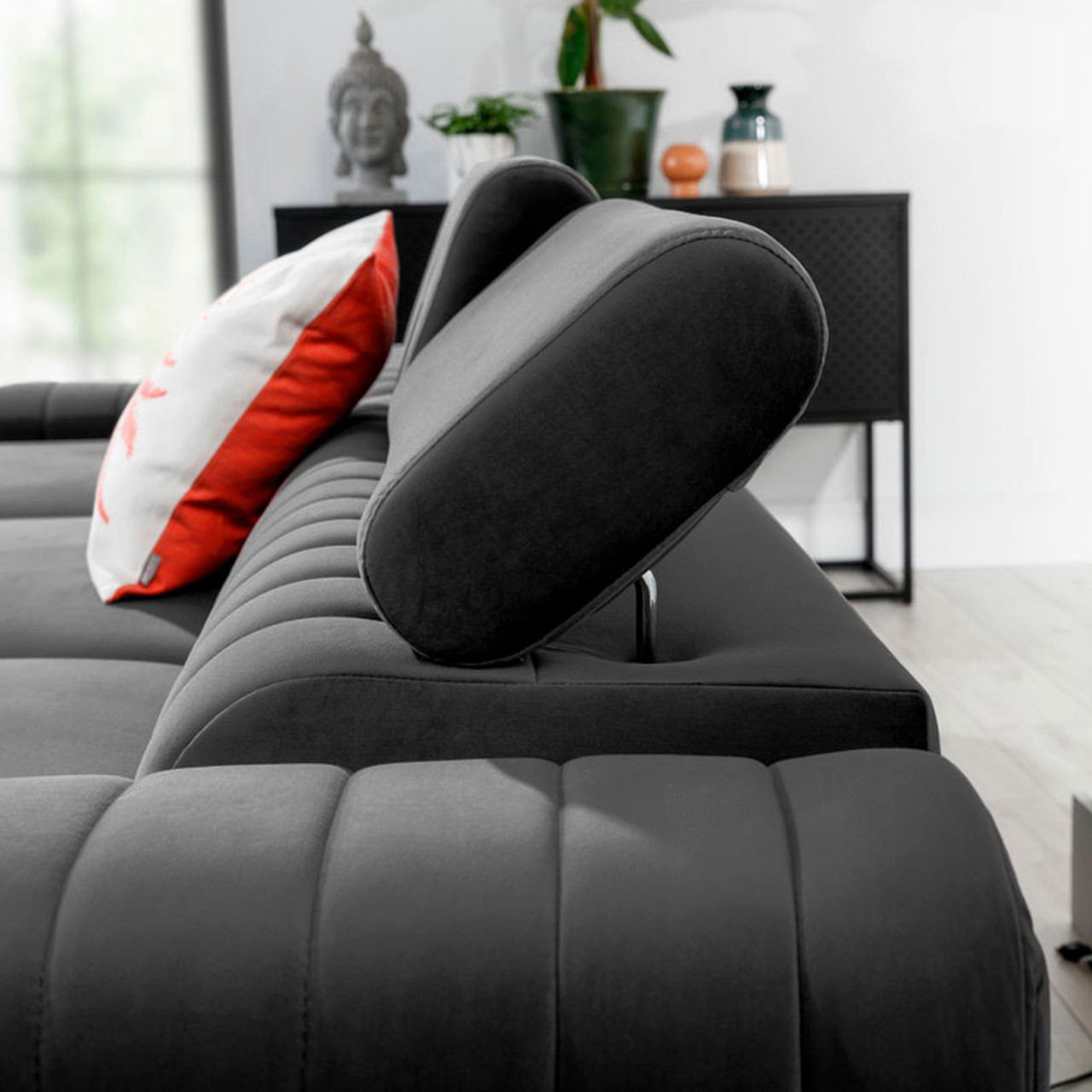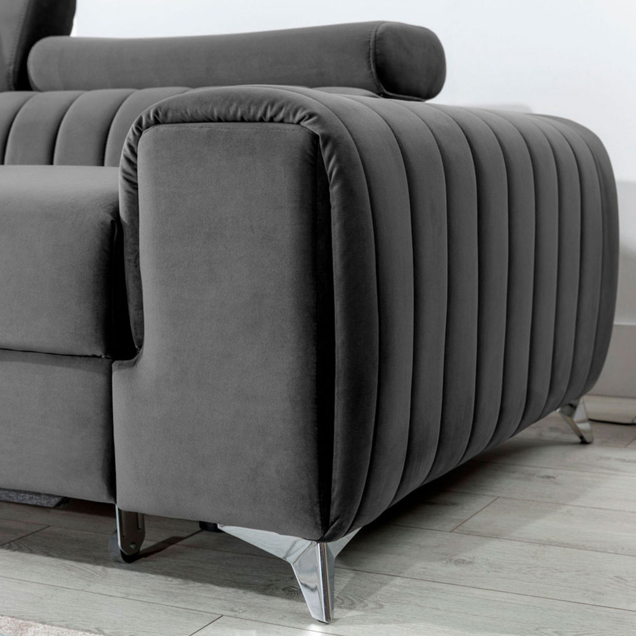 Colțarul extensibil Grayson pe stânga este o piesă de mobilier elegantă și funcțională, ideală pentru orice living. Cu dimensiuni de 278x205x92 cm, oferă un spațiu generos pentru relaxare și odihnă. Șezutul din spumă T30 și HR asigură confort de durată, iar funcția de dormit, cu o suprafață de 125x216 cm, se extinde ușor prin mecanismul tip „delfin”. Lada de depozitare integrată este perfectă pentru organizarea lenjeriei de pat. Tetierele reglabile și spătarul conturat completează designul modern, realizat cu atenție la detalii, oferind un nivel ridicat de confort. Produsul este personalizabil în funcție de culoare și material.
