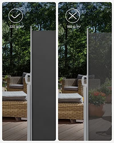 Perdea de protectie pentru terasa: aceasta copertina laterala va protejeaza de ochii curiosi ai vecinilor. Astfel, puteti lua micul dejun pe terasa. Apropo, incuietoarea pentru copii de pe maner face ca aceasta marchiza sa fie si mai fiabila 2 optiuni de instalare: utilizati flansa inclusa, insurubati-o pe podea si glisati stalpul lateral. Insurubati stalpul lateral direct pe podea daca doriti o instalare mai permanenta Oferiti-ne increderea dumneavoastra: materialele bune vorbesc de la sine. Suprafata rezistenta la rugina si coroziune cu acoperire cu pulbere, stalpi metalici de inalta calitate pentru o fixare stabila - va veti bucura de aceasta marchiza laterala timp de multi ani Tesatura pentru copertina Premium: Panza de copertina realizata din poliester de 220 gsm cu acoperire PU nu se va decolora chiar si dupa o utilizare indelungata. De asemenea, este durabila pentru o durata de viata mai lunga Ce primiti: un jaluzele cu rolete laterale de 200 x 350 cm de la Songmics, cu care va puteti proteja balconul sau terasa, precum si instructiuni detaliate (limba engleza nu este garantata) care fac instalarea rapida si usoara.