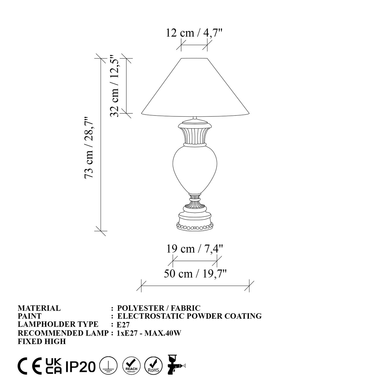 Lampa de masaAbajul din material textilMarime: 50 x 50 x 73 cmDimensiunea capacului: Ø12-50 h:25 cmTip soclu: 1 x E 27 Max 40 WBecul nu este inclus220-240 VGrad de protectie: IP20