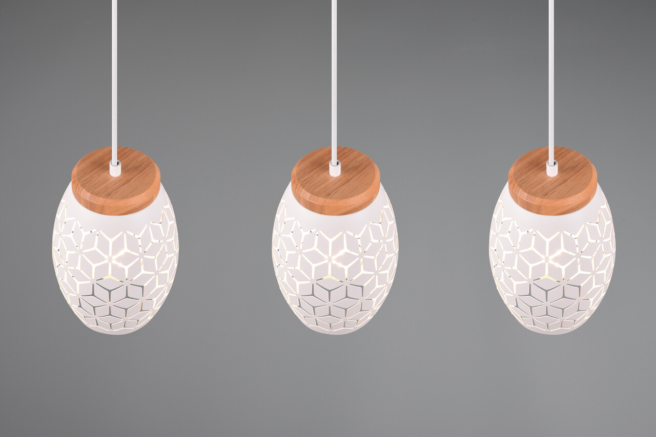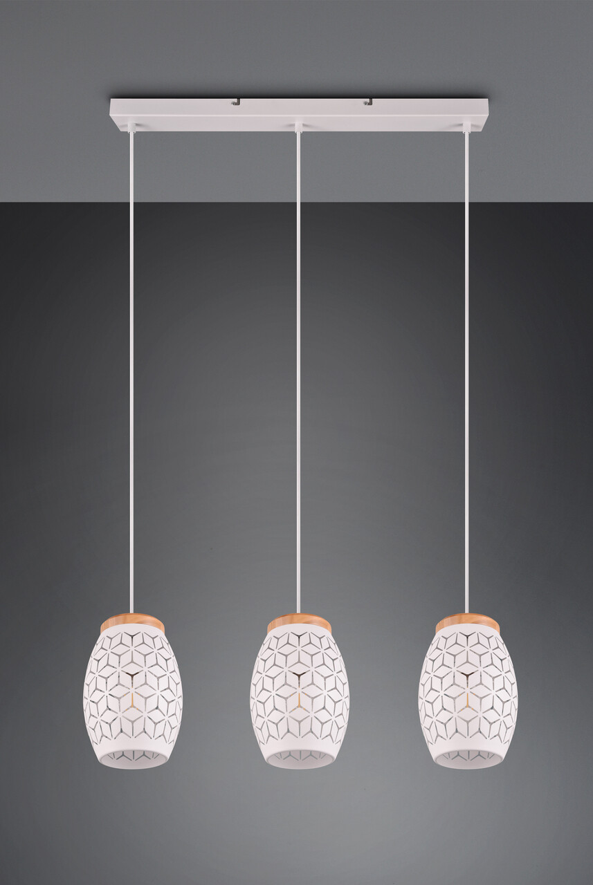 Lustra Bidar RL 71x15x150 cm 28W 3x E27 metal alb mat/natur aduce o lumină specială în orice încăpere, devenind piesa centrală a atmosferei tale. Cele trei puncte de lumină strălucesc delicat prin modele elegante, creând un joc unic de lumini. Accentele din lemn natural amplifică senzația de confort cald. Este un element vizual remarcabil, ideal pentru un iluminat modern și fiabil. Se recomandă utilizarea becurilor LED pentru o calitate superioară a luminii, durabilitate și eficiență energetică ridicată. Lustra este ușor de integrat în diverse spații, oferind o iluminare uniformă și plăcută.