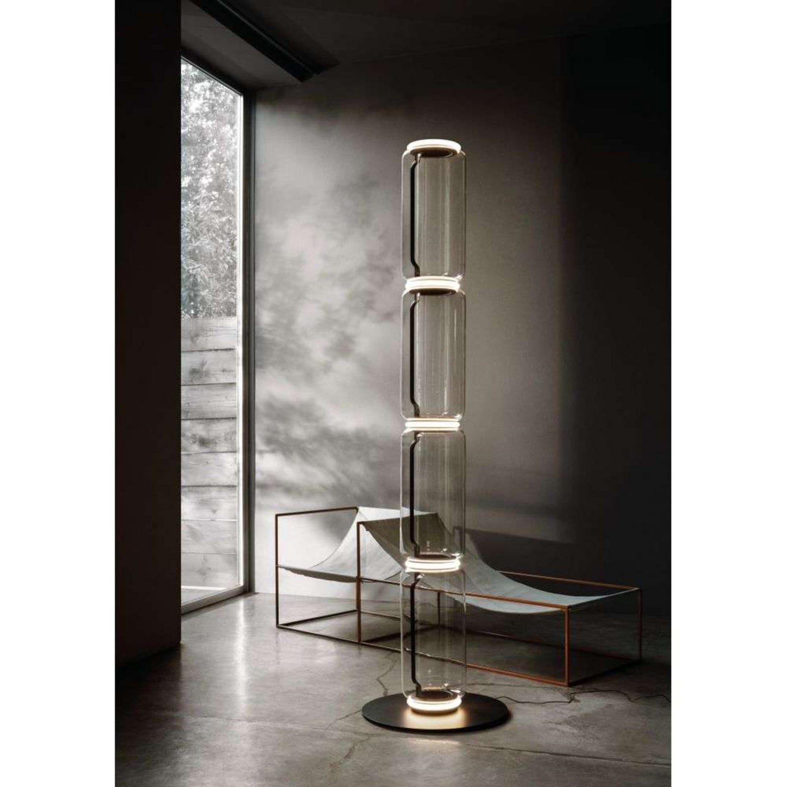 Lampă de podea de designer Noctambule, creată de Konstantin Grcic, îmbină eleganța sticlei suflate cu gura și tehnologia LED. Formele cilindrice ale celor patru elemente de sticlă oferă o transparență delicată, întreruptă de difuzoare inelare ce distribuie uniform o lumină albă caldă. Baza mare din aluminiu turnat sub presiune asigură stabilitate, iar întrerupătorul cu pedală de pe cablu permite ajustarea luminozității de la 10% la 100%. Noctambule devine, astfel, o operă de artă ce aduce un accent distinctiv în orice interior, transformându-se într-un punct de atracție în momentul în care este activată.