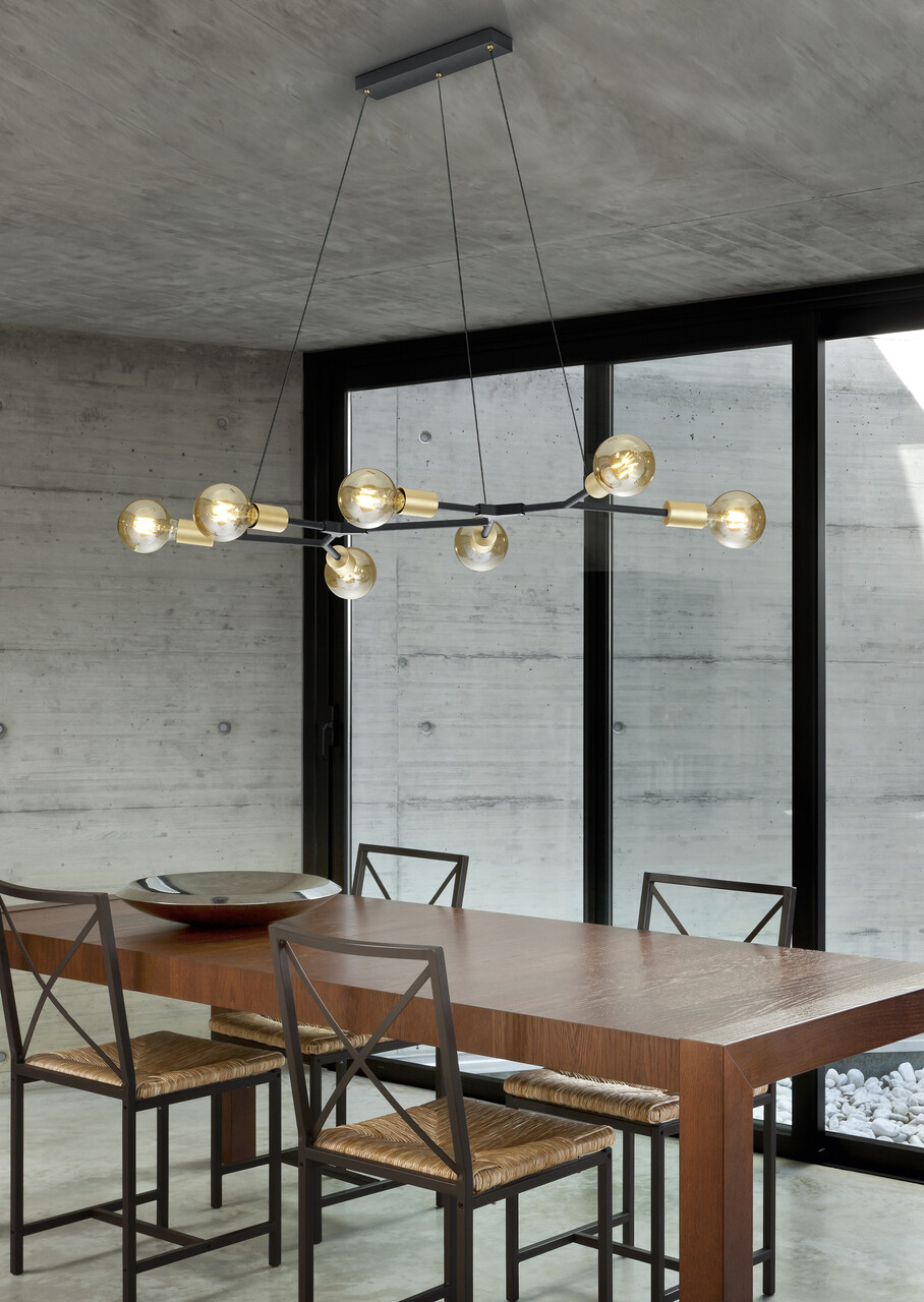 Lustra Cross TRIO 91x45x150 cm 28W 7x E27 metal negru mat/auriu aduce un aer neconvențional și creativ în orice interior. Designul său minimalist subliniază contrastele rafinate dintre culorile metalice, oferind o ambianță elegantă. Ideală pentru a fi amplasată deasupra unei mese mari sau în zona de intrare, această lustra devine un element de bun gust. Recomandăm utilizarea becurilor cu filament pentru un aspect armonios, dar și becuri LED pentru o iluminare modernă și eficientă. Durabilă și versatilă, lustra Cross este alegerea perfectă pentru un iluminat de calitate.
