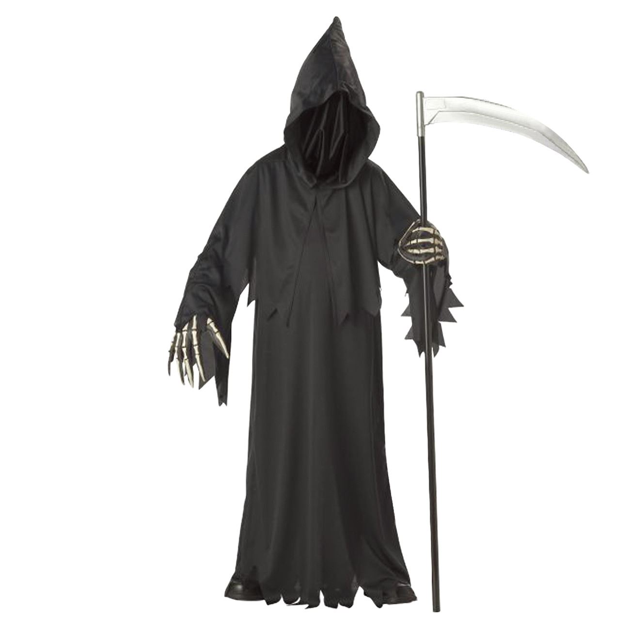 Pregateste-te pentru Halloween cu un costum infricosator de Moartea cu Coasa! Costumul include atat tinuta neagra, lunga, cat si o gluga potrivita pentru a completa look-ul terifiant. Realizat din material de poliester de calitate, acest costum asigura confortul si durabilitatea necesara pentru o seara plina de distractie si sperieturi. Perfect pentru baieti, acest costum transforma orice copil intr-un personaj emblematic al Halloween-ului. Tot ce ai nevoie pentru a impresiona la petrecerea de Halloween se afla in acest costum. Noteaza ca coasa nu este inclusa in pachet. Imbraca-te si fii pregatit pentru a aduce frica in inimile tuturor!