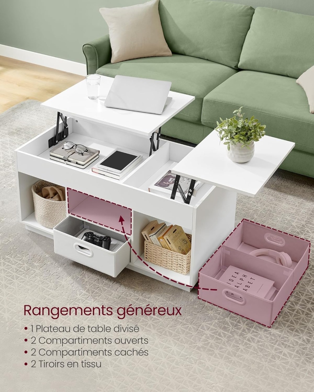 Descoperiți eleganța și funcționalitatea cu măsuța de cafea extensibilă Vasagle, un element esențial pentru orice living modern. Cu un design rafinat și linii curate, această masă permite adaptarea perfectă la nevoile dumneavoastră, datorită mecanismului de ridicare pe două direcții. Dispune de două compartimente deschise și două sertare pentru stocare organizată. Construcția robustă asigură stabilitate și siguranță, iar designul modern adaugă un plus de stil oricărei încăperi. Măsuța poate fi folosită ca masă de cafea, dining sau birou. Dimensiuni: 100 x 50 x 48.5 cm. Comandați acum!
