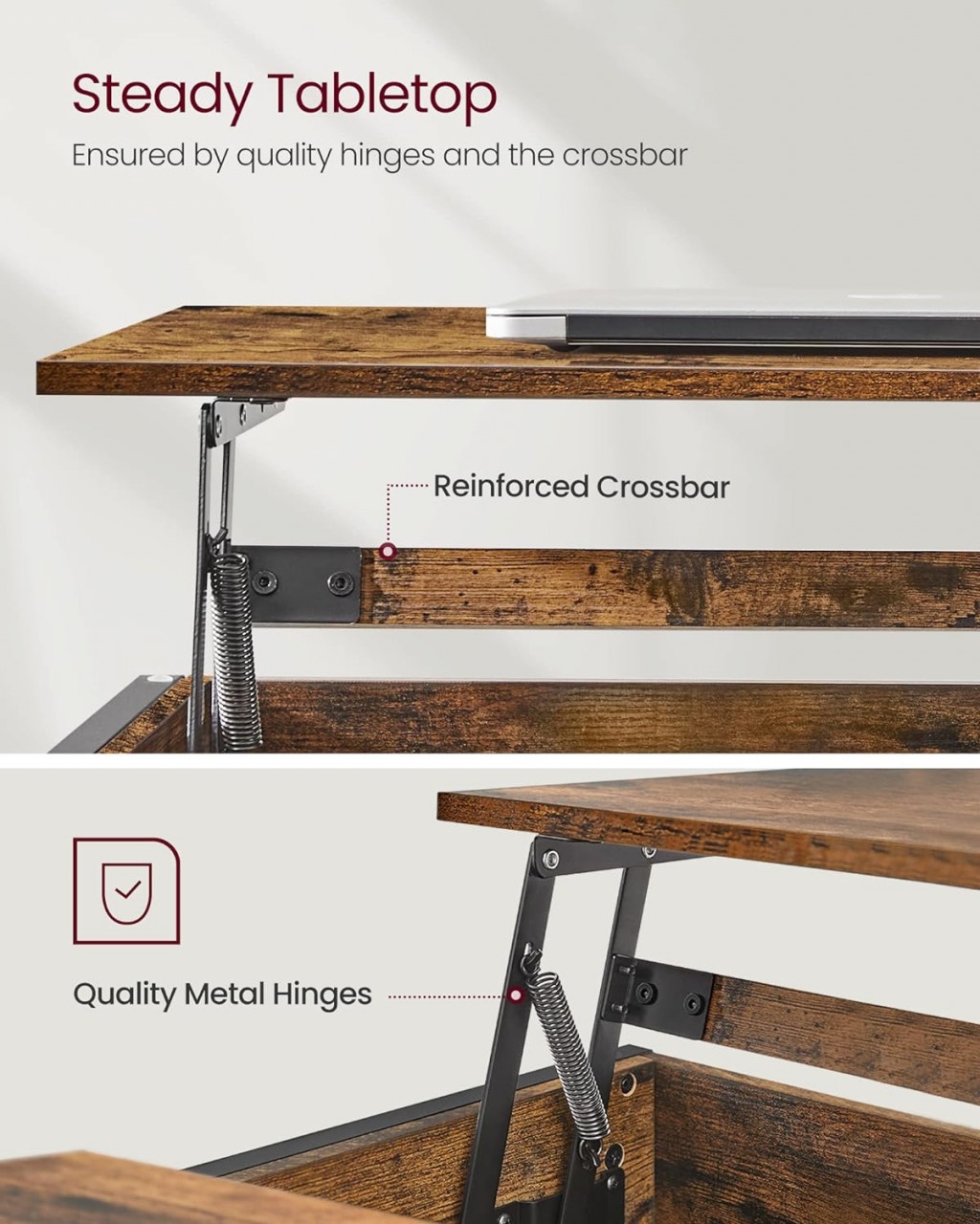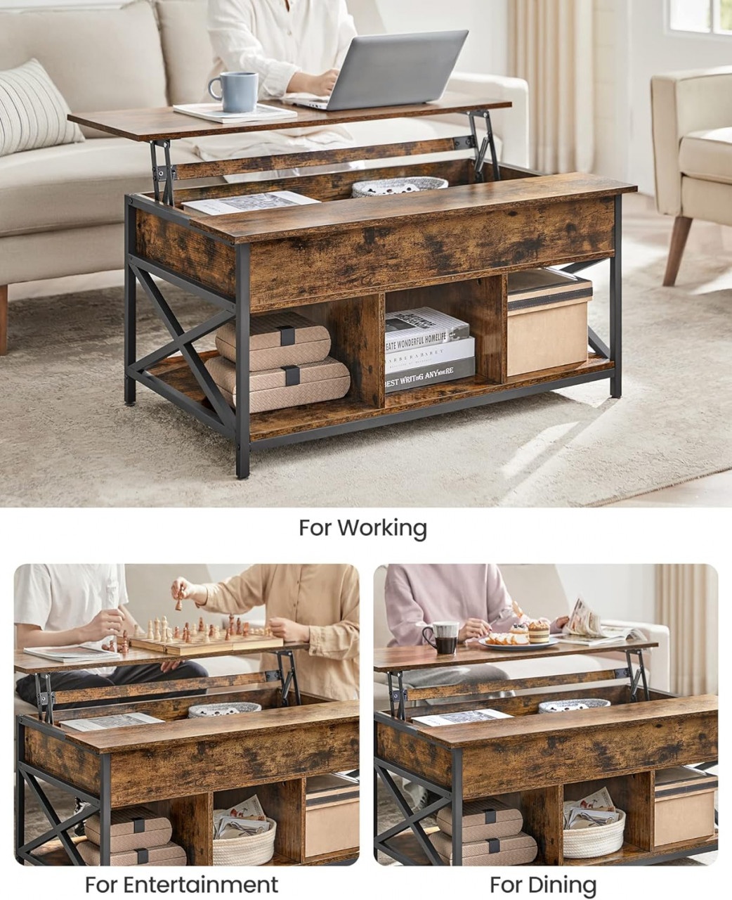 Masuța de cafea Vasagle Maro-Negru (100x60x48-62 cm) combină funcționalitatea cu un design atractiv. Cu un blat ce se ridică, permite lucrul de acasă sau servirea mesei confortabil de pe canapea. Dispune de 3 compartimente deschise pentru acces rapid la jocuri și cărți, iar compartimentul ascuns păstrează obiectele la discreție. Picioarele din oțel negru adaugă un aer industrial, în timp ce blatul maro camel oferă o notă caldă. Asamblarea este simplă, iar întreținerea se efectuează ușor, datorită materialelor rezistente la apă.