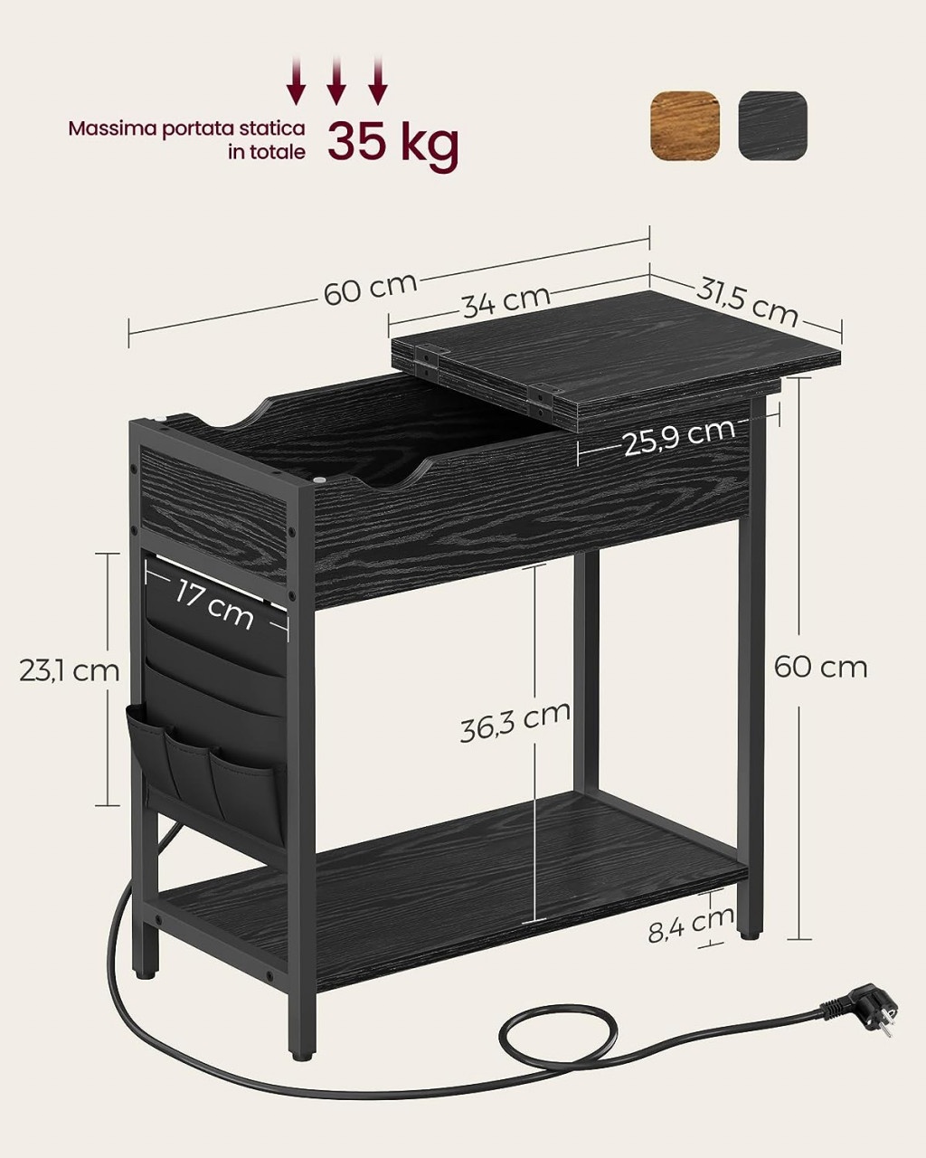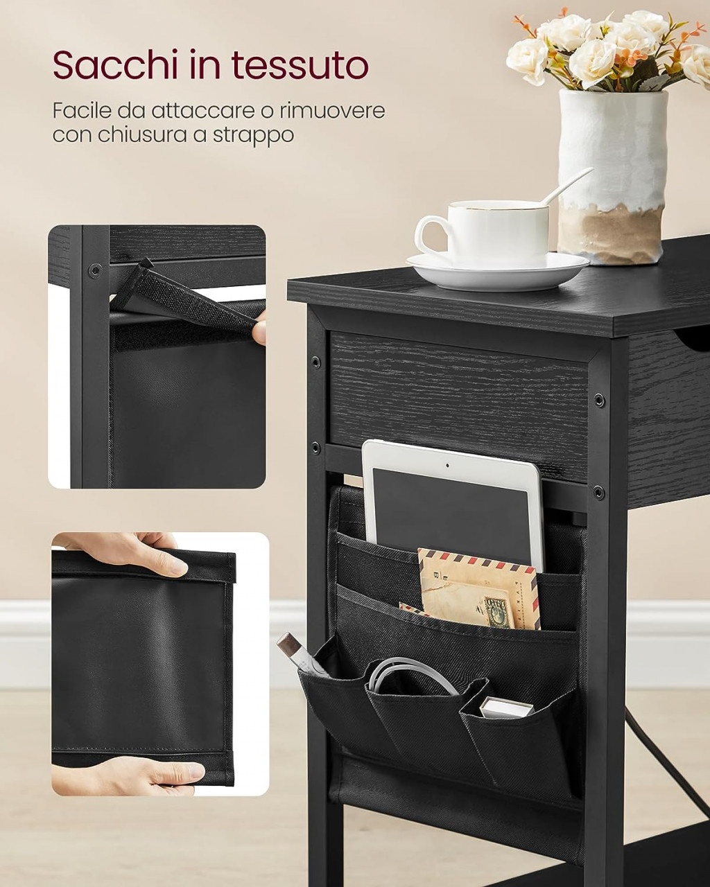 Măsuța laterală Vasagle de 60 x 31,5 x 60 cm, în culoare neagră, este soluția ideală pentru încărcarea și organizarea dispozitivelor tale. Echipată cu 2 prize de alimentare, 2 porturi USB și un cablu de 2,1 m, permite încărcarea simultană a mai multor aparate. Compartimentul său ascunde obiectele de uz casnic, iar raftul deschis oferă un loc perfect pentru reviste și decoratiuni. Genti textile incluse, de diferite dimensiuni, păstrează la îndemână tabletele, notebook-urile și telecomenzile. Designul său compact se potrivește perfect în spații mici.