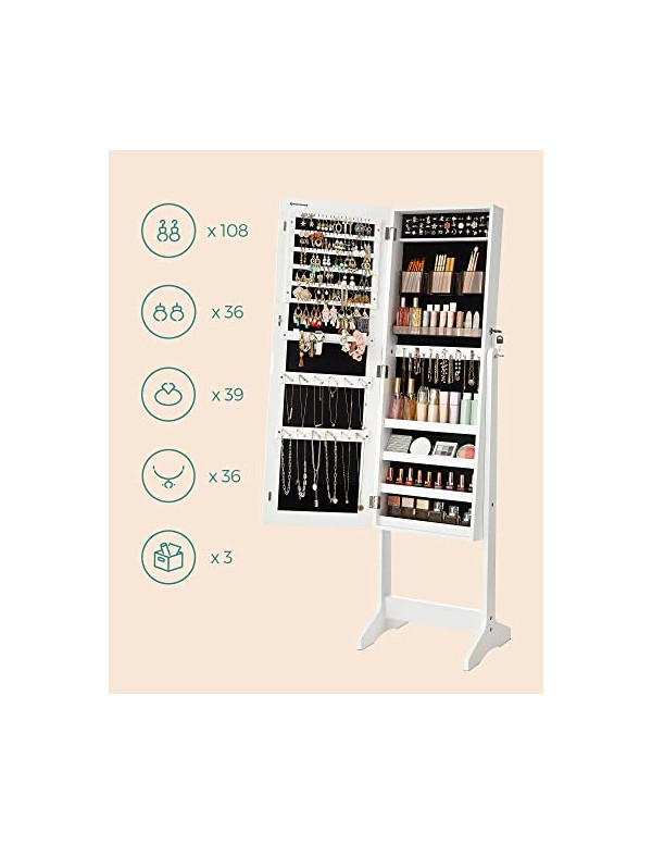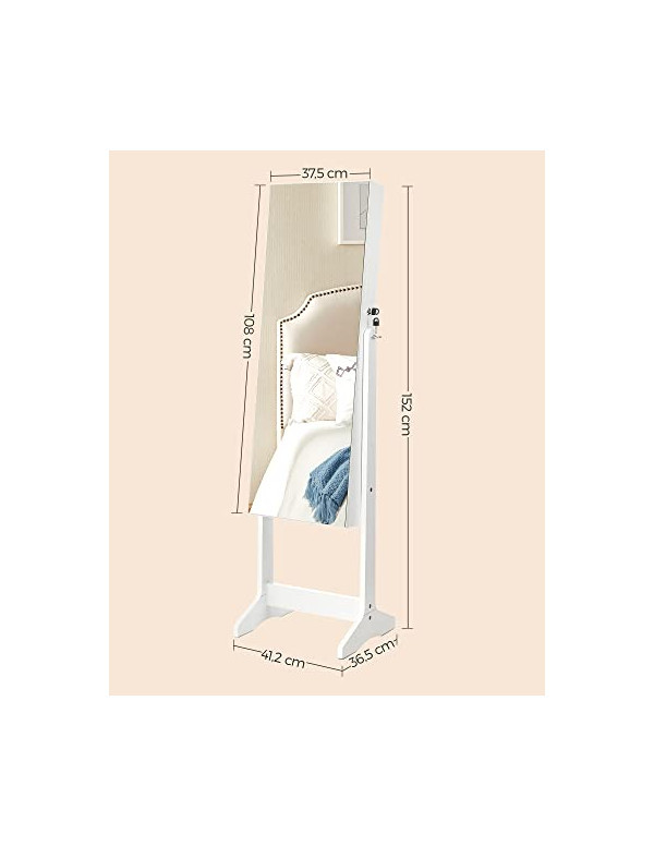 Dulapul pentru depozitare bijuterii și oglindă Songmics UJJC002W01 este soluția perfectă pentru a-ți organiza bijuteriile într-un mod elegant. Construit din MDF de calitate, acest dulap alb se integrează ușor în orice decor. Cu dimensiuni de 41.2 x 36.5 x 152 cm, oferă suficient spațiu pentru toate accesoriile tale. Greutatea de 11.4 kg asigură stabilitate, iar pachetul include 2 chei pentru securitate, un kit de accesorii, un kit anti-răsturnat și instrucțiuni pentru montaj. Rămâi organizată și în stil cu acest dulap funcțional și atrăgător!