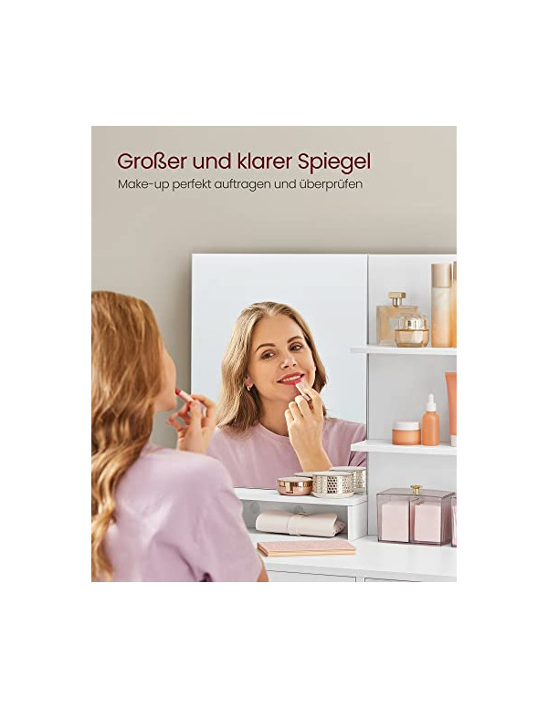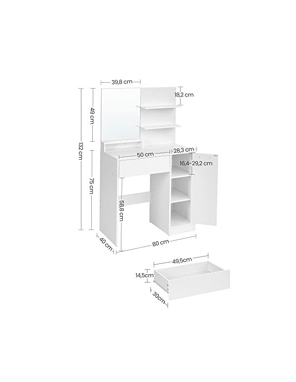 Masa de toaleta cu oglinda si rafturi Vasagle este un element elegant si functional pentru orice camera. Cu dimensiuni de 80 x 40 x 132 cm, aceasta masa ofera suficient spatiu pentru produse de makeup si accesorii. Culoarea alba si designul modern din PAL aduc un plus de luminozitate si rafinament. Greutatea de 27.8 kg asigura stabilitate, iar pachetul include tot ce ai nevoie pentru asamblare, inclusiv instructiuni. Transformă-ți rutina de beauty într-o experiență plăcută cu aceasta masa de toaleta versatila si stilata.