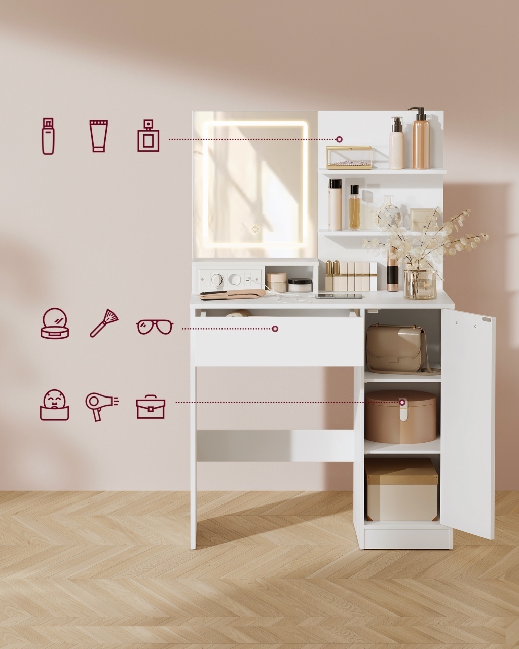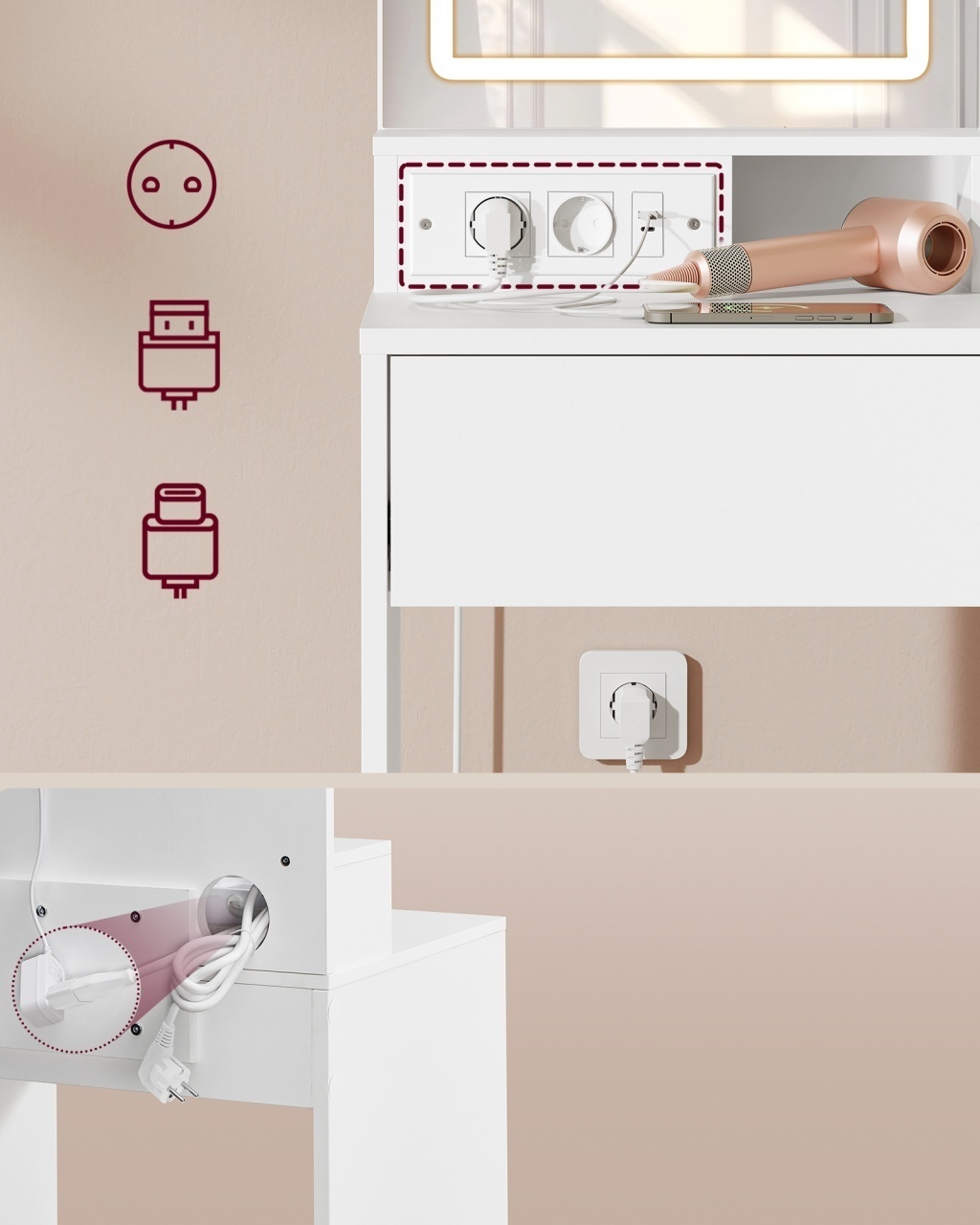 Masa de toaletă și machiaj Vasagle 80 x 40 x 132.5 cm — Organizare cu stil și iluminare inteligentă Design modern și materiale de calitate Cu un finisaj alb desăvârșit și suprafețe netede, această masă de toaletă aduce o notă de rafinament în dormitorul tău, astfel încât fiecare dimineață să înceapă într-o ambianță plăcută și ordonată. Realizată din MDF și PAL durabil, completată de o oglindă cu iluminare LED, piesa impresionează prin estetică și stabilitate , conferind decorului o prezență premium fără efort. Funcționalitate și organizare Gândită pentru a valorifica fiecare centimetru, masa oferă rafturi deschise, un sertar practic și un compartiment inferior cu ușă, astfel încât parfumurile, cremele și instrumentele de coafat să aibă locuri dedicate și ușor accesibile. Cu ajutorul prizei integrate care include două prize AC, un port USB-A și unul USB-C, poți încărca rapid dispozitivele și appareilurile de înfrumusețare, în timp ce sertarele și rafturile îți permit să organizezi , protejare și optimizezi rutina zilnică, pentru un spațiu mereu ordonat și primitor. Montaj și întreținere Construcția robustă din PAL și MDF face ca produsul să fie ușor de întreținut; suprafețele sunt rezistente la uzură și se curăță rapid cu o cârpă moale, astfel încât masa păstrează un aspect îngrijit pe termen lung. Montajul este simplu și este însoțit de accesorii de montaj, iar pentru siguranță este inclus un kit anti-răsturnare pentru fixarea mesei în perete, oferind liniște și durabilitate , siguranță și stabilitate . Comandă acum Transformă-ți rutina de înfrumusețare — comandă masa de toaletă Vasagle și adaugă un strop de eleganță funcțională în dormitor. Detalii tehnice complete Dimensiuni și greutate Dimensiuni produs: 80 x 40 x 132.5 cm Greutate produs: 26.8 kg Materiale și caracteristici Material corp: MDF și PAL Material tapițerie/finisaj: N/A Culoare: Alb Montaj și pachet Stare asamblare: Neasamblat Conținut pachet: 1 x Masă de toaletă și machiaj, Accesorii de montaj, Kit anti-răsturnare (sistem de fixare în perete), Manual de utilizare Stil și origine Stil: Modern / Minimalist Destinație recomandată: Dormitor, hol Informații importante Pentru siguranța utilizării, masa trebuie fixată în perete cu ajutorul kitului anti-răsturnare inclus; acest lucru reduce riscul de răsturnare și asigură stabilitate în utilizarea zilnică. Produsul include componente electronice (oglindă LED și priză integrată); evită expunerea la umezeală și urmează instrucțiunile din manual pentru conectare și utilizare. Manualul poate să nu fie în limba engleză; te rugăm să verifici conținutul înainte de montaj.