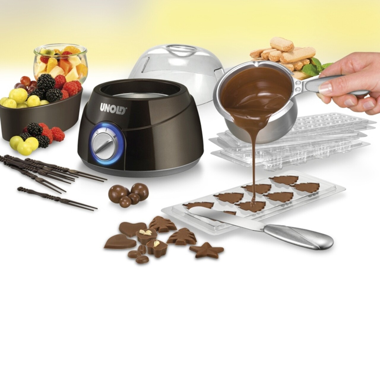 Cu aparatul pentru ciocolata Unold puteti topi pana la 250 ml de ciocolata in cateva minute. Trebuie doar sa adaugati bucatele de ciocolata in vasul pentru topire, sa selectati temperatura si peste cateva minute veti avea ciocolata lichida, iar ciocolata fondue poate fi servita. Puteti folosi fructe proaspete, biscuiti sau prajituri - imaginatia nu are limite. Cu acest aparat puteti sa creati propriile ciocolate in tot felul de forme cu ajutorul vasului pentru topire detasabil cu care puteti turna ciocolata in cele 6 forme pe care le veti gasi in pachet. Caracteristicile aparatului: Putere: 25W; Capacitate: 250 ml; 2 setari de temperatura: 85°C si 115°C; Vas pentru topire detasabil, din aluminiu; Lumina indicatoare de culoare albastra; Dimensiuni: 15 x 15 x 11.5 cm; Culoare: maro/argintiu. Accesorii: 6 forme pentru ciocolata si 6 furculite fondue; 1 spatula; 1 furculita pentru ciocolata; 2 recipiente din plastic pentru fructe; Manual de instructiuni cu retete.