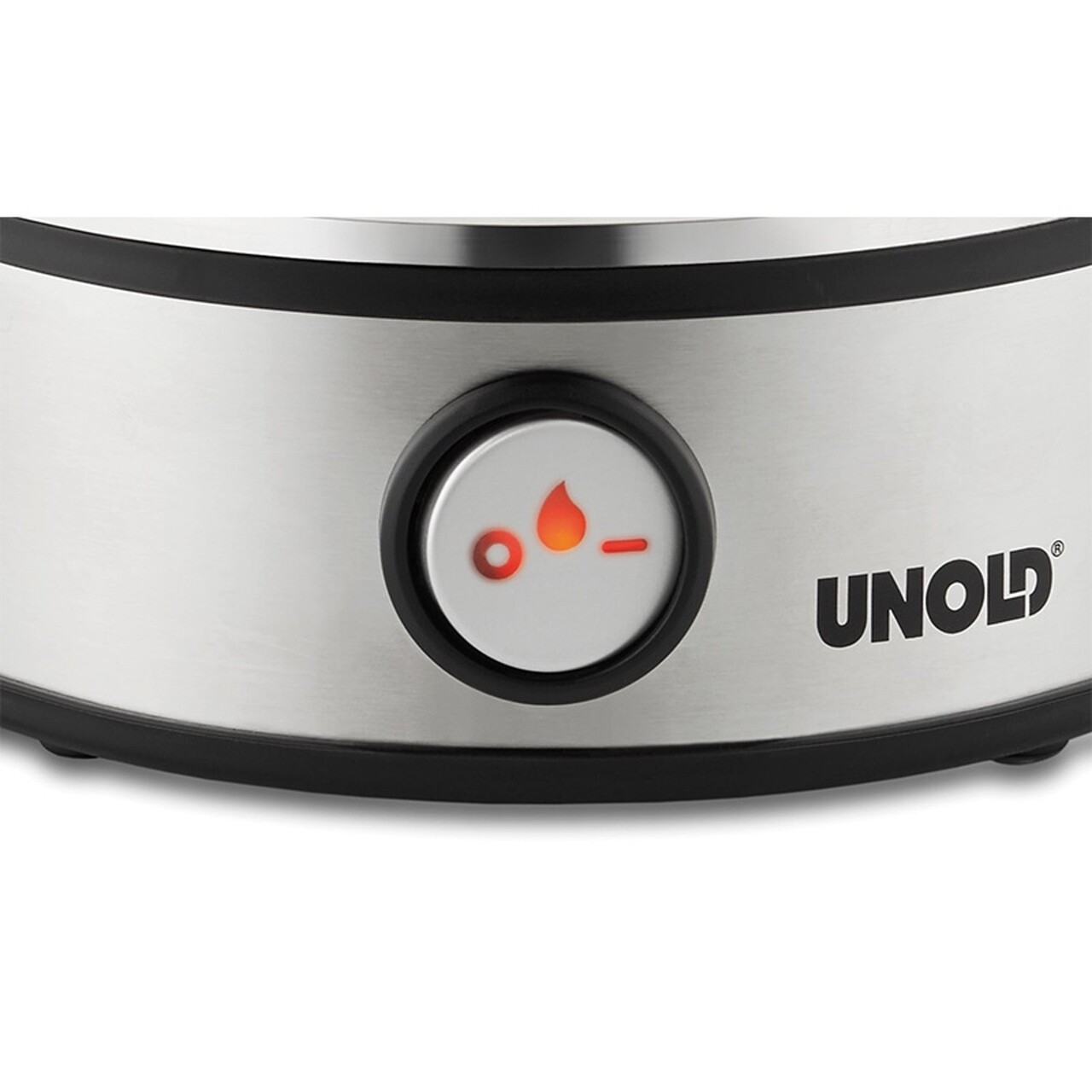 Cu acest fierbator pentru oua Unold, fabricat din inox cu puterea 360 W, puteti fierbe pana la 7 oua.  Doriti sa preparati un ou moale, mediu sau tare? Nicio problema, masurati cantitatea necesara de apa cu ajutorul paharul de masurare gradat. Daca este prea gatit, semnalul acustic semnaleaza: Gata!”. Corpul satinat al fierbatorului este fabricat din inox. Cu o greutate de 500 de grame, aparatul cu puterea 360 W prepara rapid 7 oua. Dispozitivul fara BPA semnaleaza printr-un semnal sonor finalizarea procesului de gatire. Comutatorul de pornire/oprire si led-ul de operare asigura usurinta in utilizare. Toate piesele detasabile sunt sigure in masina de spalat vase, iar cablul lung de aproximativ 80 cm ofera flexibilitate. Caracteristici: Tava cu maner pentru 1 pana la 7 oua; Bol de gatit din inox; Emite un semnal sonor cand se atinge gradul de preparare dorit; Led luminos functionare; Toate piesele detasabile pot fi curatate in masina de spalat vase; Carcasa din inox de inalta calitate; Comutator pornire/oprire; Nu contine BPA; Putere: 360 W, 22-240 V ~, 50 Hz; Dimensiuni (Lxlxh): aproximativ 15,8 x 18,2 x 16,4 cm; Lungime cablu alimentare: 80 cm. Culoare: inox/negru. Accesorii: pahar de masurare gradat si ac pentru ou.