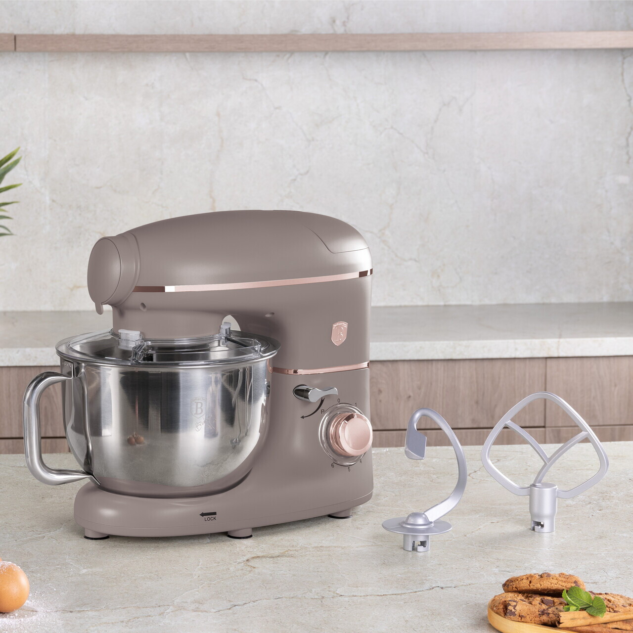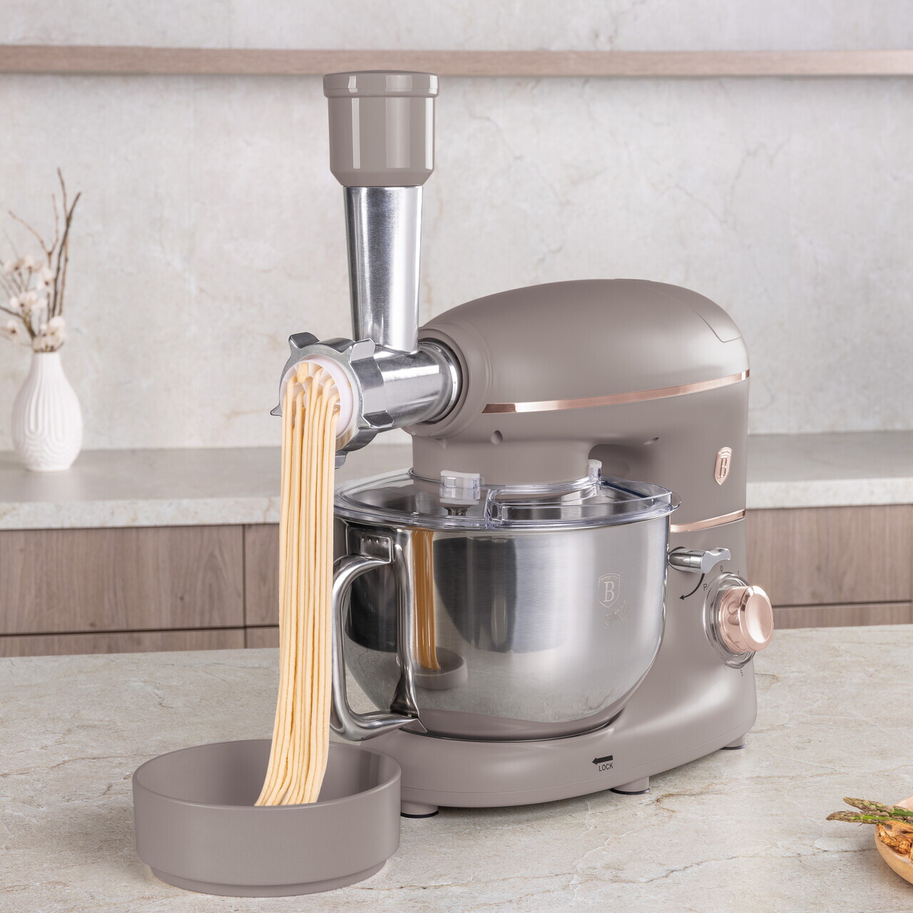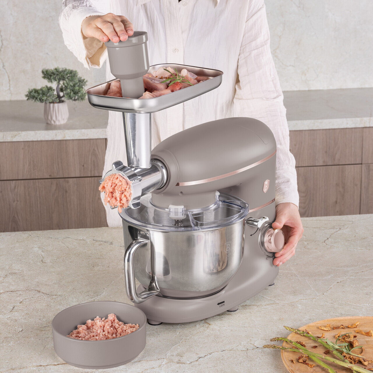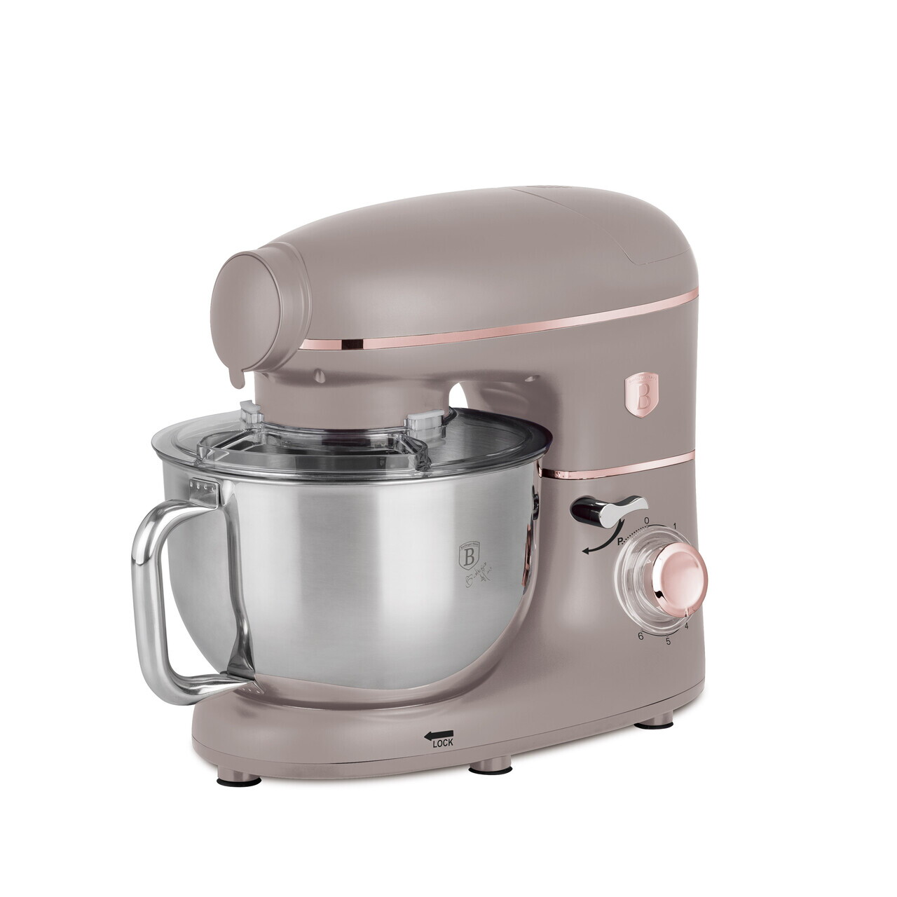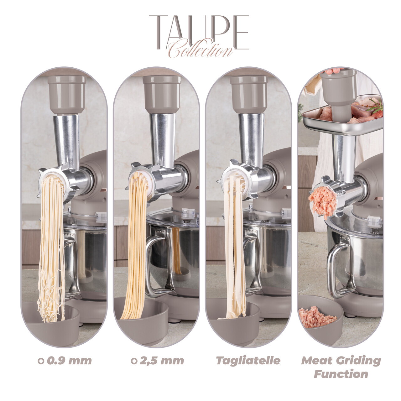 6 viteze fara trepte cu functie pulsBol din otel inoxidabil de 5.5 L cu finisaj oglinda si maner lateralIndicator luminos LEDMotor special cu zgomot redusOrificiu de turnareSistem de fixare a boluluiCap inclinabil cu comutator de sigurantaRotatie planetara pentru amestecare completaMaterial: otel inoxidabil si plastic1500 W, 220-240V, 50-60 HzInclude:Bol din otel inoxidabil 18/10, 5.5 LCarlig pentru aluat antiaderentTel antiaderentTel de mixatMasina de tocat carne cu tava si 3 accesorii pentru pasteAparatoare antistropireVas de blender din sticla de 1.5 L cu capac din plastic (mixer)Lungimea cablului de alimentare: 100 cmCuloare: taupe mat