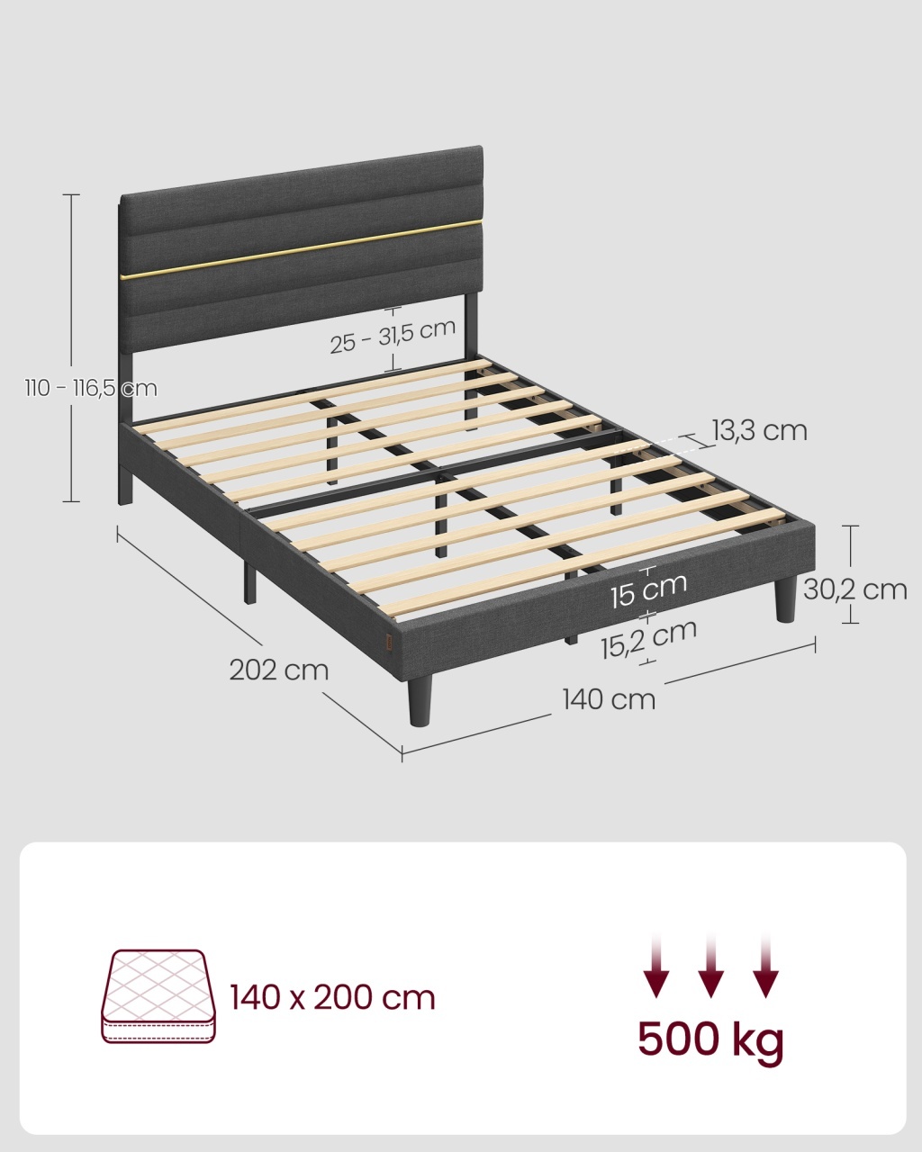 Cadru de pat Vasagle 201x140.5x116.5 cm — Confort și stabilitate premium Design modern și materiale de calitate Acest cadru de pat îmbină liniile moderne cu texturi atent alese, astfel încât dormitorul tău capătă imediat o ambianță rafinată și primitoare. Tapițeria cu aspect de in, finisată într-un elegant gri ardezie , și detaliile decorative aurii conferă piesei o notă de eleganță fără ostentație, iar capul rabatabil tapițat oferă un suport confortabil atunci când te sprijini pentru lectura de seară. Construcția din oțel combinată cu lamele din lemn de plop garantează o prezență solidă în dormitor, în timp ce spuma densă asigură un contact plăcut și un plus de confort . Funcționalitate și organizare Proiectat pentru a susține un spațiu de odihnă bine organizat, cadrul este compatibil cu saltele de 140 x 200 cm și acceptă grosimi de saltea între 25 și 31,5 cm, ceea ce îl face extrem de versatil pentru diverse nevoi. Cele 9 picioare robuste și lamelele din lemn distribuie eficient presiunea, oferind o stabilitate excepțională și o susținere optimizată pentru cupluri sau utilizatori care caută o bază durabilă; astfel, te vei bucura de un somn liniștit fără zgomote nedorite, datorită căptușelilor din spumă EVA aplicate pe barele verticale. În ansamblu, designul transformă funcțiile tehnice în avantaje palpabile: protecție , durabilitate și versatilitate . Montaj și întreținere Montajul este simplu și rapid grație instrucțiunilor clare și pieselor numerotate, astfel încât vei avea patul gata în scurt timp fără complicații inutile. Finisajul cu strat protector anti-rugină și materialele ușor de întreținut recomandă curățarea locală cu o cârpă moale și evitarea soluțiilor abrazive, iar tapițeria cu aspect de in permite întreținere blândă pentru a păstra aspectul premium. Pentru siguranța family, recomandăm fixarea suplimentară în perete, astfel încât piesa să ofere stabilitate maximă în utilizare; toate acestea asigură o experiență de utilizare ușoară și sigură, punând accent pe ușurință de asamblare , întreținere și siguranță . Comandă acum Alege acum cadrul de pat Vasagle și transformă dormitorul într-un refugiu de confort și rafinament — comandă rapid și primește calitate premium acasă. Detalii tehnice complete Dimensiuni și greutate Dimensiuni produs: 201 x 140.5 x 110.5–116.5 cm (L x l x H) Greutate produs: 24.15 kg Capacitate maximă: 500 kg Materiale și caracteristici Material corp: Oțel și lamele din lemn de plop Material tapițerie/finisaj: Țesătură cu aspect de in și burete (spumă densă) Culoare: Gri ardezie Montaj și pachet Stare asamblare: Neasamblat Conținut pachet: 1 x Cadru de pat, Accesorii de montaj, Manual de instrucțiuni Stil și origine Stil: Modern Destinație recomandată: Dormitor