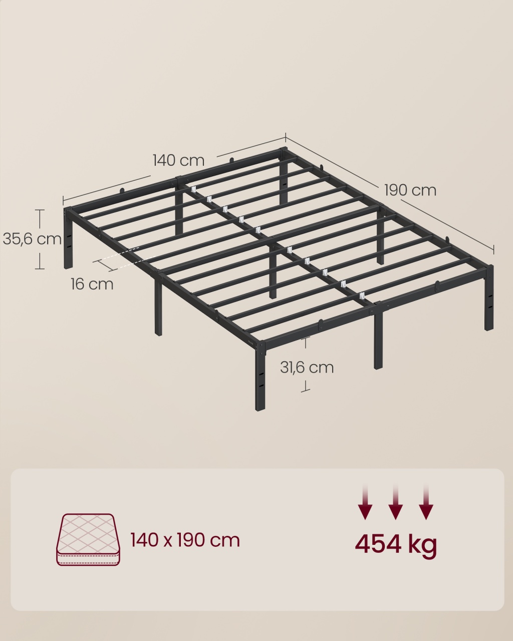 Cadru de pat Vasagle 190x140x35.6 cm — Spațiu de depozitare optim și stabilitate premium Design modern și materiale de calitate Cu linii clare și un finisaj negru mat, acest cadru de pat aduce un aer de rafinament și simplitate în dormitor, astfel încât decorul tău să respire eleganță fără efort. Construit din oțel robust , fiecare element transmite durabilitate și stabilitate , oferind o prezență vizuală discretă, dar sigură. Datorită combinației de formă minimalistă și finisaj atent, cadrul se integrează cu ușurință în multiple stiluri de amenajare, conferind încăperii o notă premium și o estetică îngrijită. Funcționalitate și organizare Spațiul util sub pat este gândit pentru a optimiza fiecare centimetru: golul de 31,6 cm dintre pardoseală și lamelele de susținere permite depozitarea cutiilor și trecerea robotului aspirator, astfel încât ordinea și curățenia devin mai simple și mai eficiente. Designul cu 9 picioare și lamele solide asigură o susținere serioasă, astfel că cadrul susține până la 450 kg , ceea ce îl recomandă în mod ideal și ca pat pentru oaspeți sau pentru utilizare frecventă. Detalii practice precum găurile pre-găurite pentru montarea tăbliei, penele care împiedică alunecarea saltelei și ștucele de protecție pentru podea aduc un plus de versatilitate și protecție pentru casa ta. Montaj și întreținere Asamblarea este concepută pentru a fi intuitivă, datorită instrucțiunilor ilustrate și pieselor numerotate, astfel încât poți finaliza montajul rapid și fără bătăi de cap cu ajutorul kitului de asamblare inclus. Întreținerea este la fel de simplă: suprafețele din oțel se curăță ușor cu o cârpă moale, evitându-se substanțele abrazive care pot afecta finisajul; în plus, glisoarele pentru podea reduc zgomotul și protejează pardoseala. Pentru siguranță suplimentară, designul stabil minimizează riscul de răsturnare, iar dacă dorești precauție adițională, recomandăm fixarea pe perete cu accesorii adecvate (nu incluse), oferind astfel un nivel sporit de siguranță , stabilitate și întreținere ușoară . Comandă acum Adaugă în coș cadrul de pat Vasagle pentru o soluție elegantă, spațioasă și fiabilă; bucură-te de organizare inteligentă și confort durabil. Detalii tehnice complete Dimensiuni și greutate Dimensiuni produs: 190 x 140 x 35,6 cm Greutate produs: 15,3 kg Capacitate maximă: 450 kg Materiale și caracteristici Material corp: Oțel, finisaj negru mat Culoare: Negru mat Montaj și pachet Stare asamblare: Neasamblat Conținut pachet: 1 x Cadru de pat, Accesorii de montaj, Instrucțiuni de asamblare Stil și origine Stil: Modern Destinație recomandată: Dormitor / Cameră pentru oaspeți