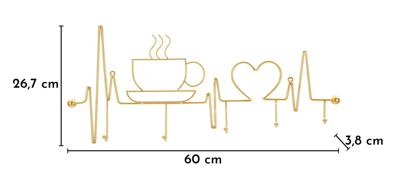 Un omagiu adus placerii zilnice a cafelei. Profilul auriu creeaza o linie continua care alterneaza ceasca, inima si pulsul, transformand un simplu cuier intr-o decoratiune eleganta pentru bucatarie sau living.