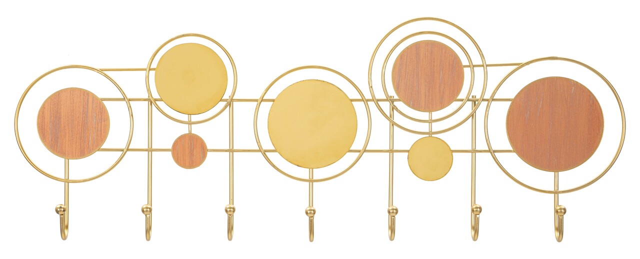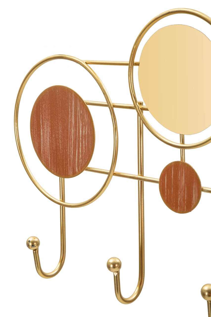Compozitie moderna din cercuri si oglinzi din metal auriu, cu nuante de cupru si argint. Perfect pentru a adauga un accent artistic si luminos holurilor sau coridoarelor elegante.